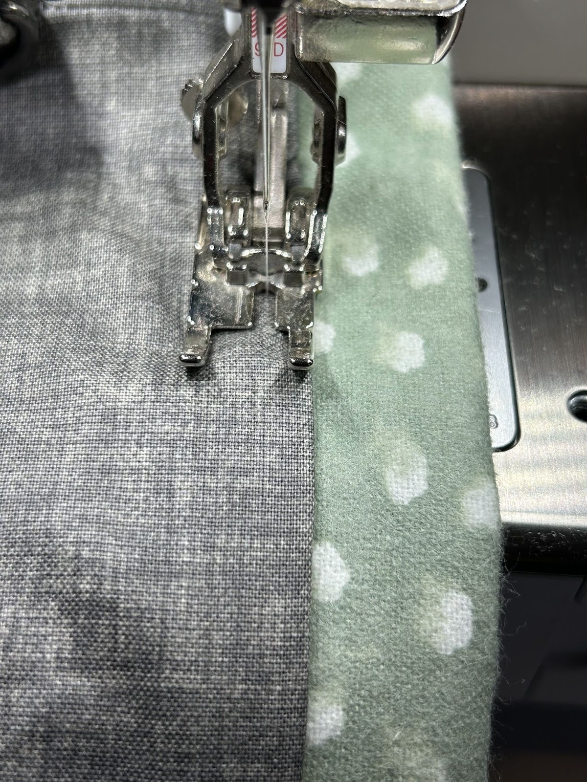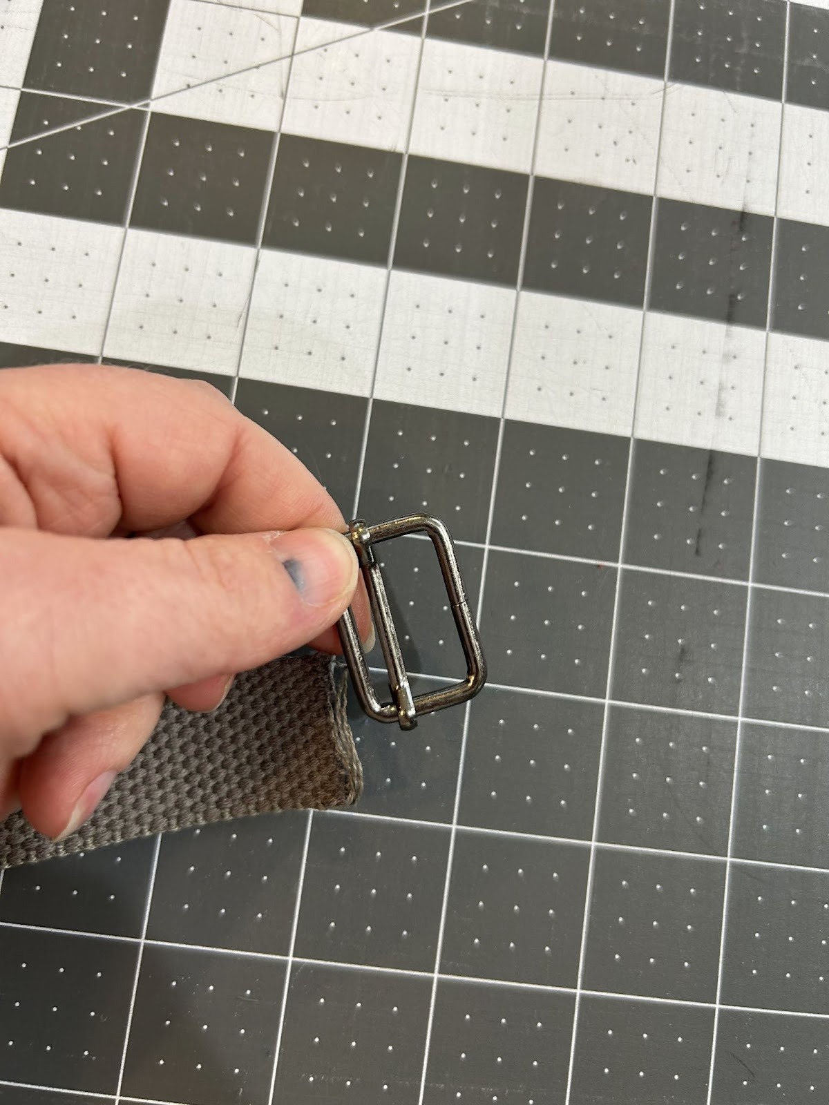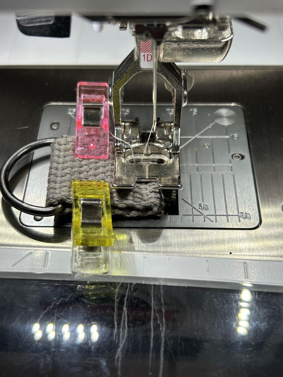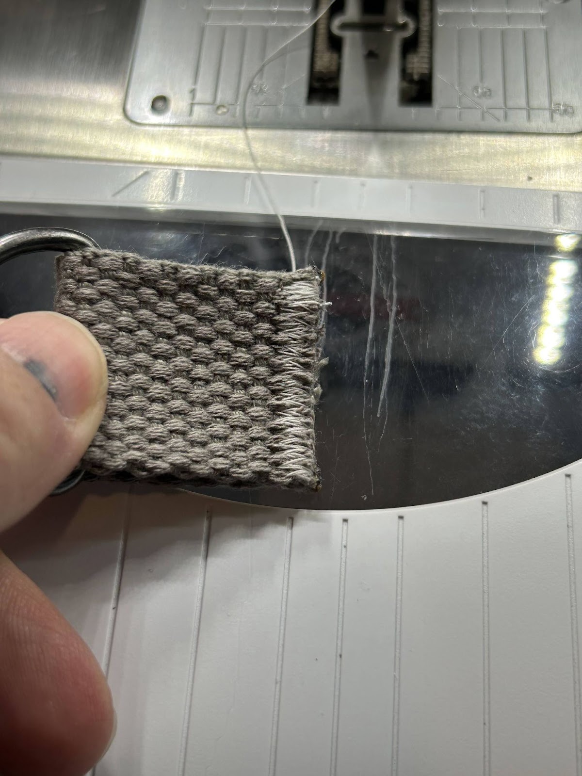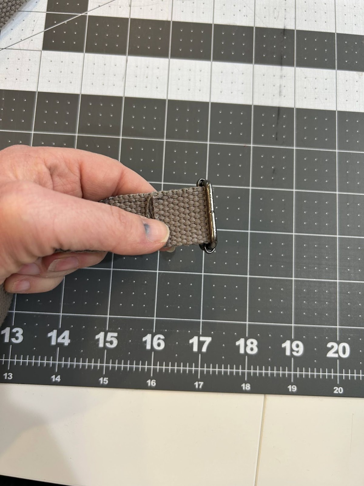 Overlap the webbing by about 1½” and stitch it down. I like to do a wide zigzag to help keep the strap from fraying. Depending on the width of your machine's presser foot you may have to overlap a bit more or you can do a bit less.