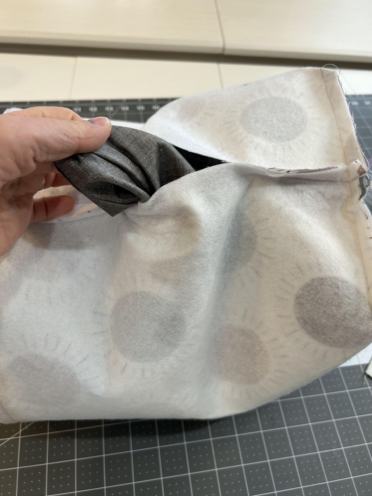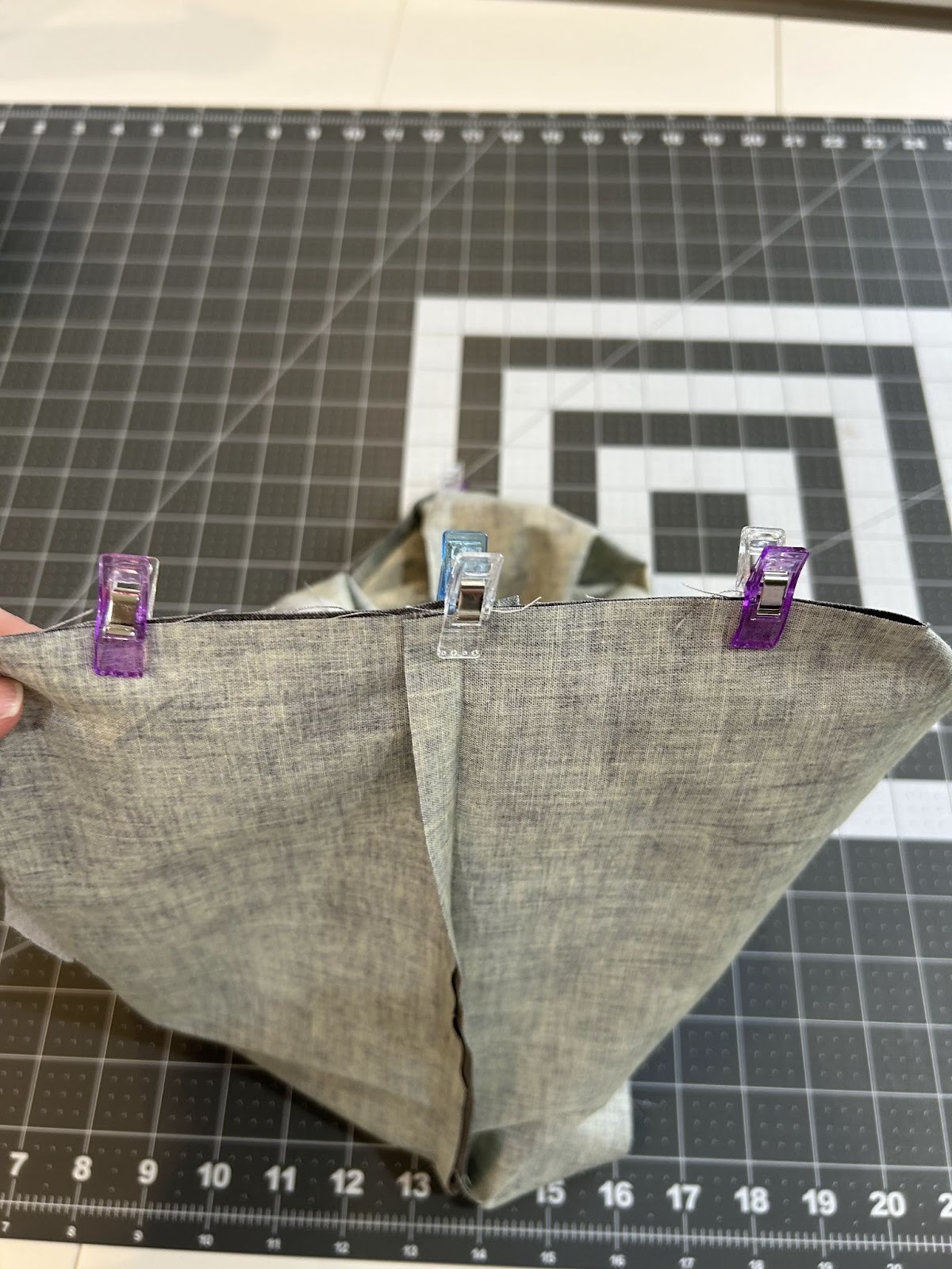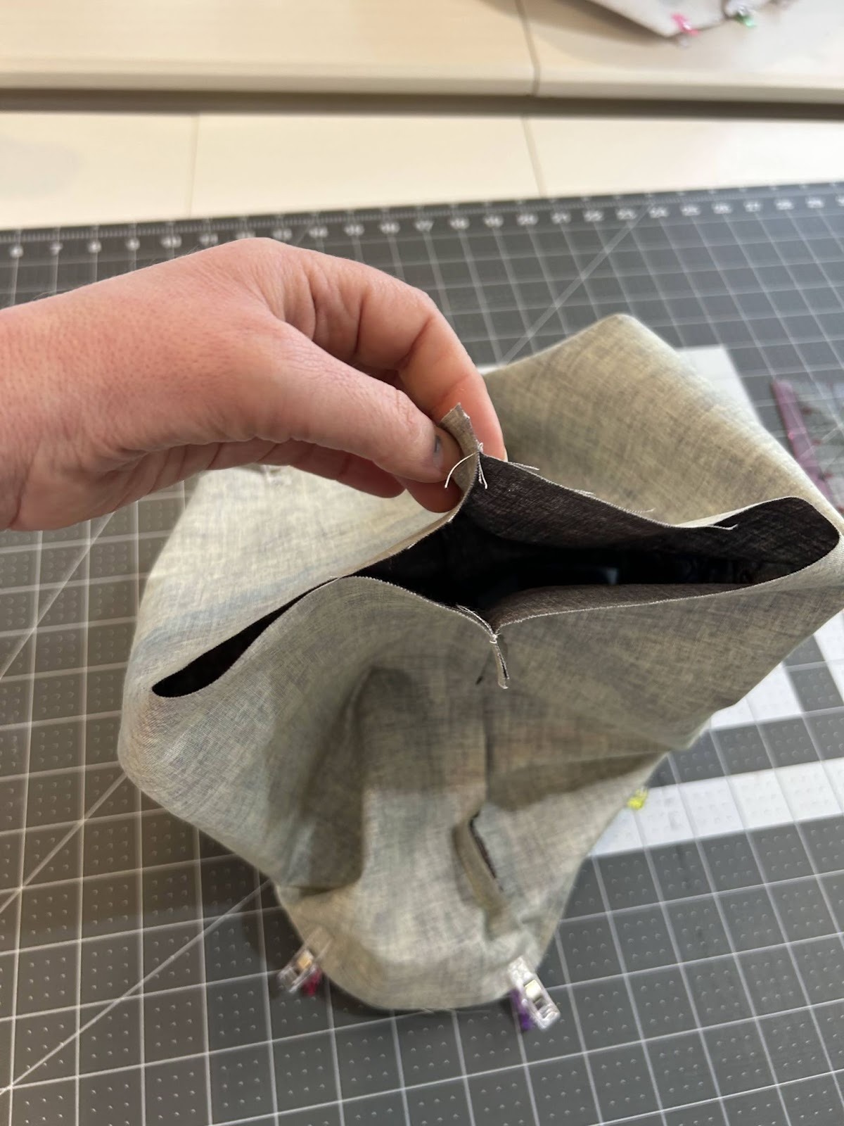 Now it’s time to box our corners. I like to sit my bag on the workspace with the bottom up and then pull the bottom seam and side seam together.