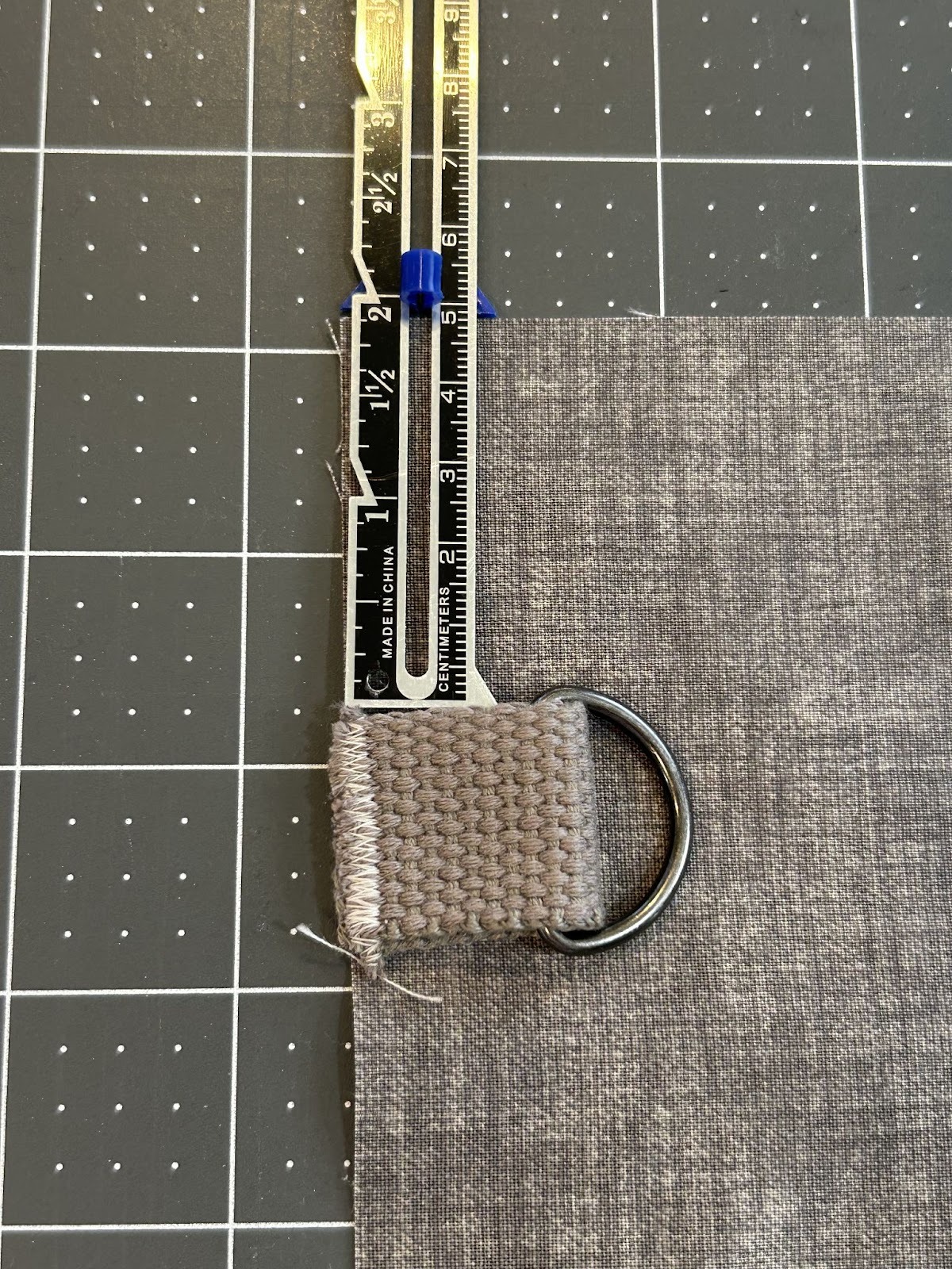Place the front of your bag right side up on your work surface. Place the top of each D-ring 2” from the top on the left and right sides. Place the D-ring toward the center with the edge of the strap lining up with the raw edge of the fabric.