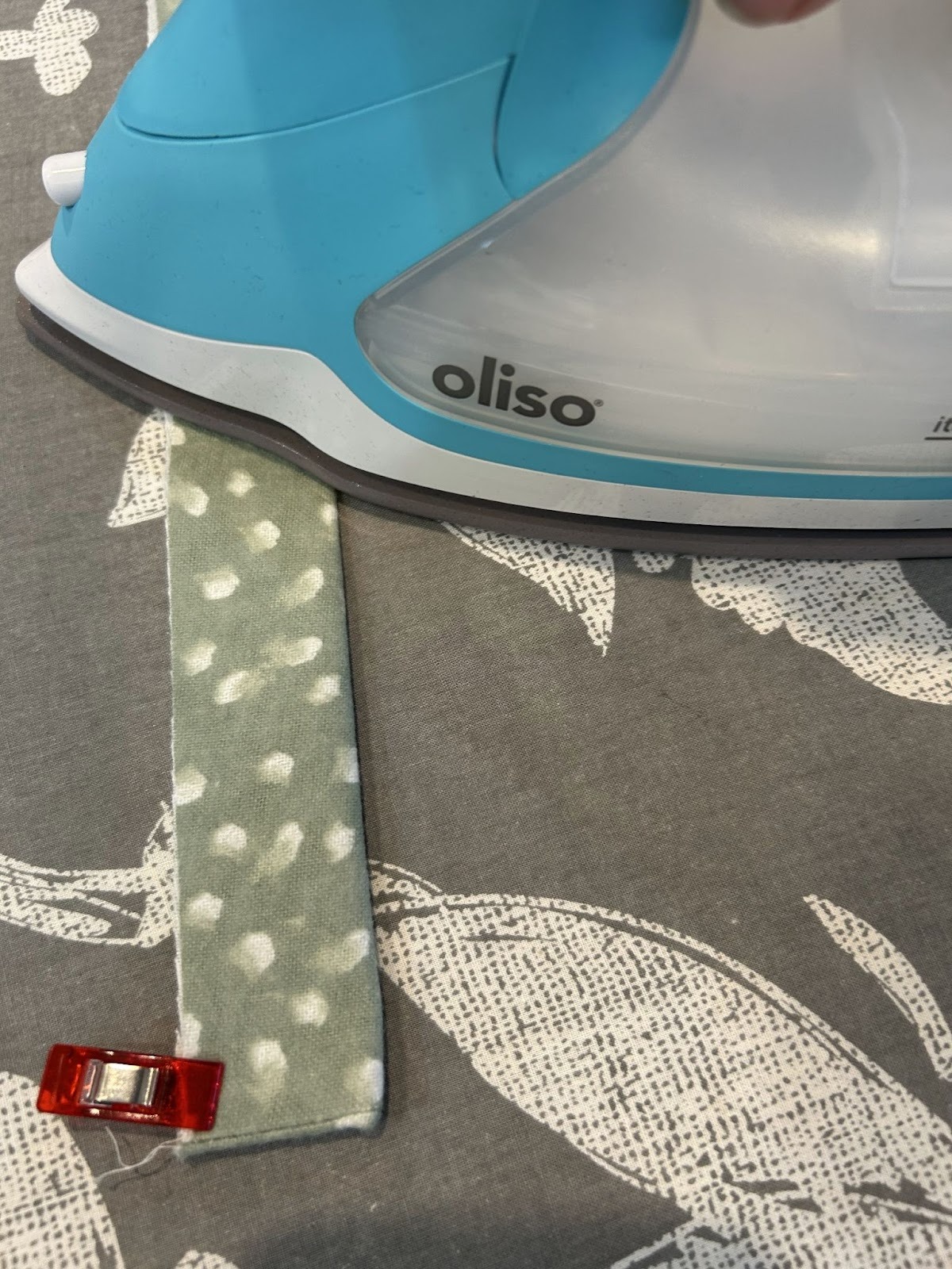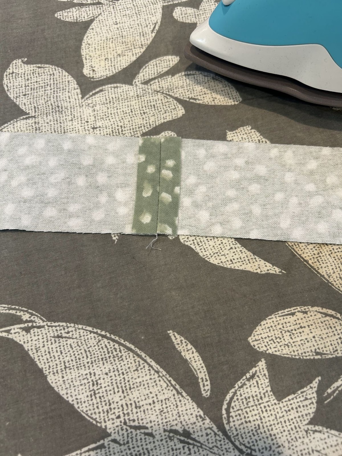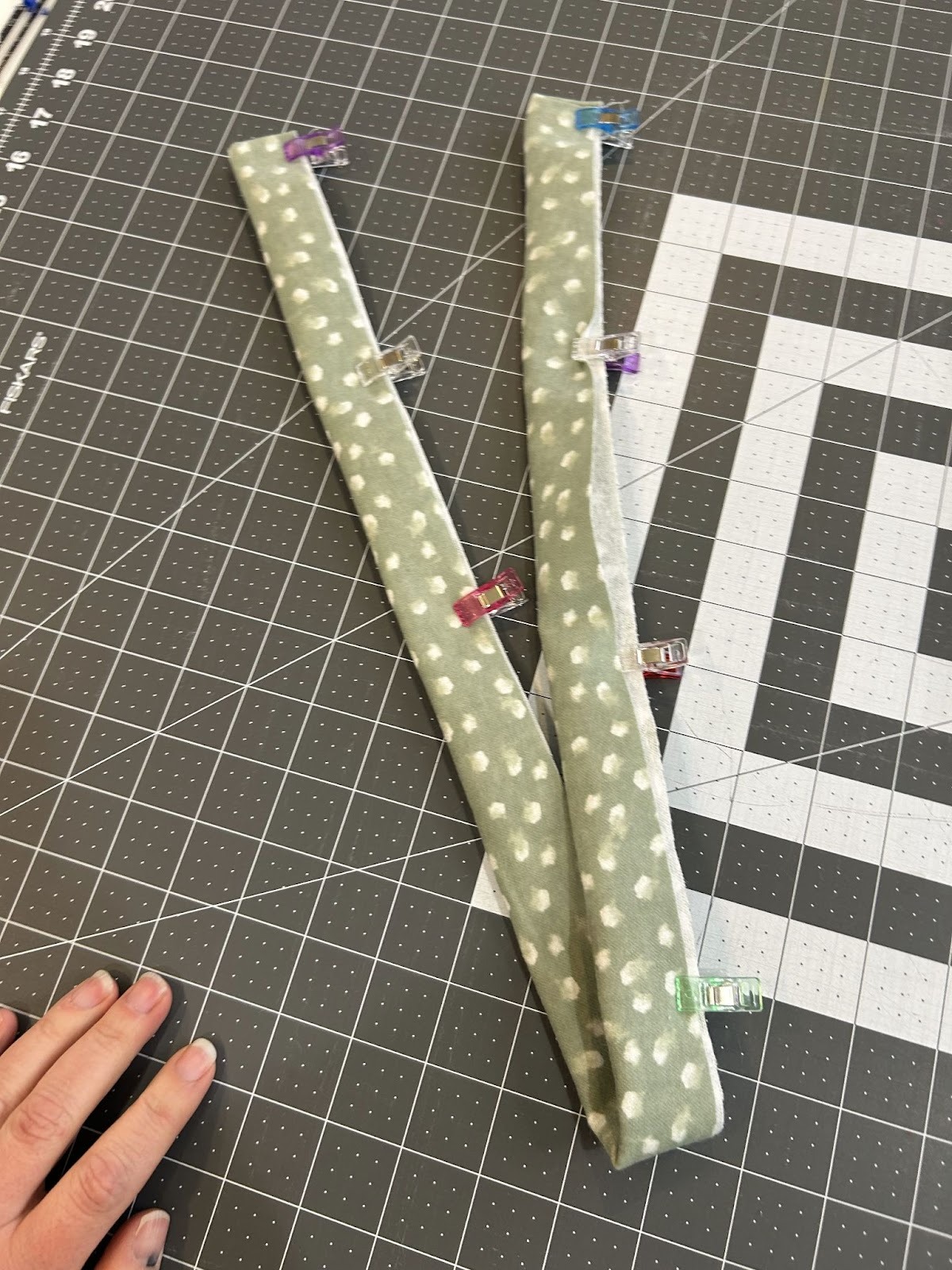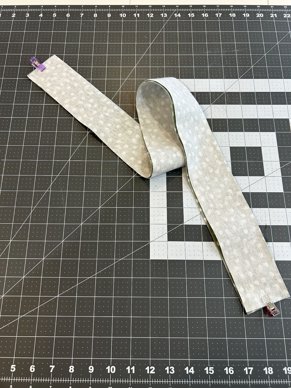 Fold the long strip in half so it now measures 1¼” by 32”. Press the fold and clip the edges.
