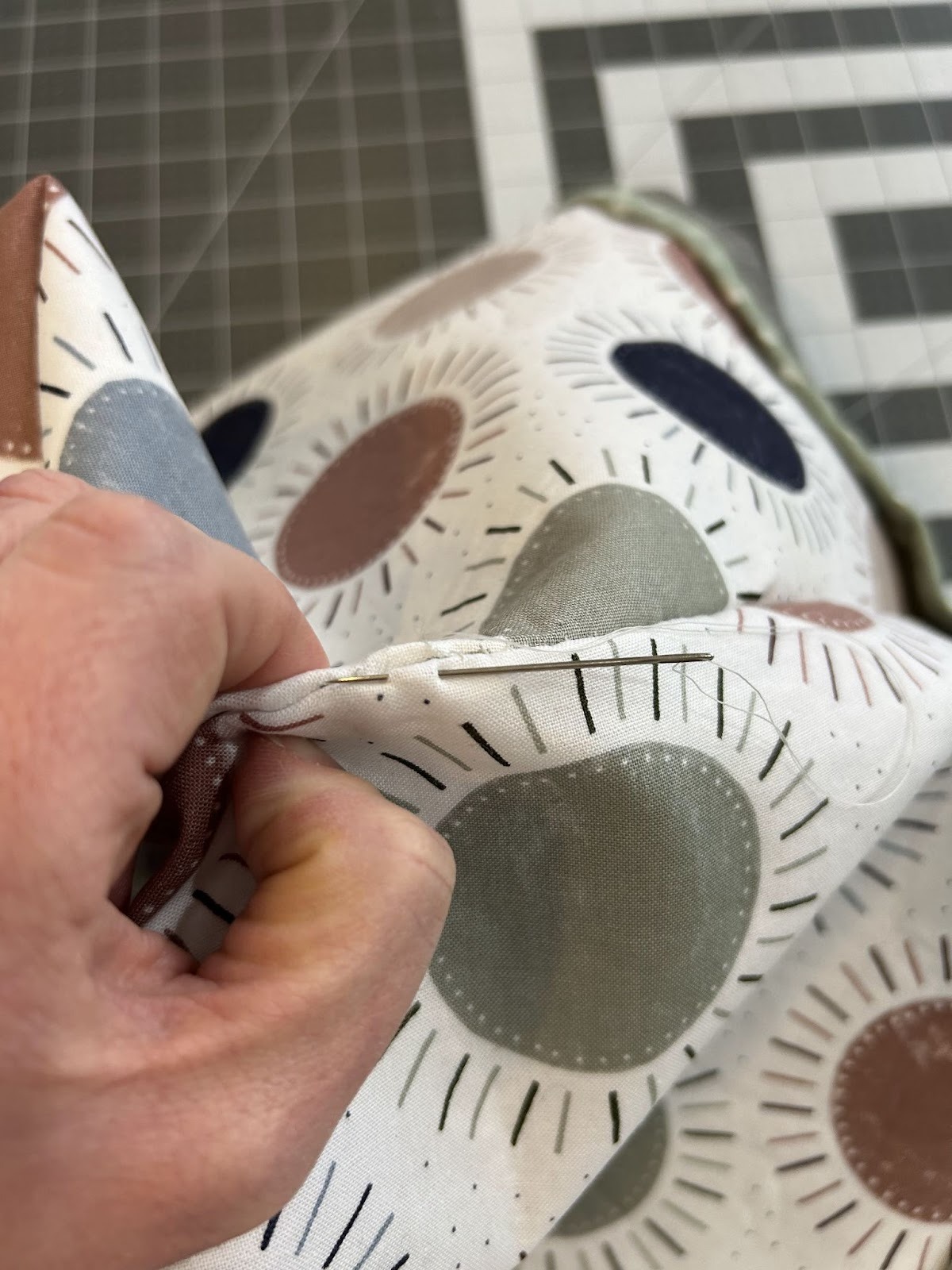 Using the same ½” seam allowance, stitch across this box seam. Repeat for the other corner on the cover fabric and both corners of the lining fabric.