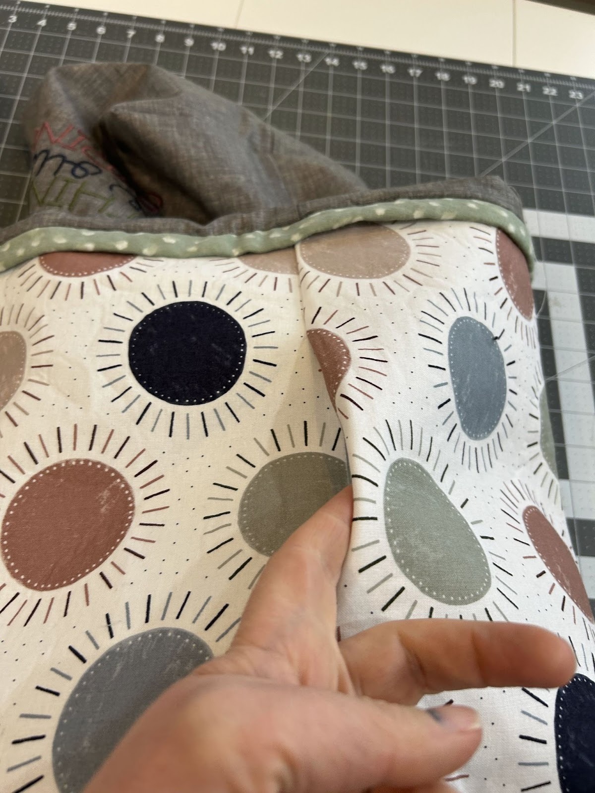 Then I do an edge stitch close to the seam on the cover. Don’t stitch on the casing as you’ll need all the space in there to get your drawstring through.