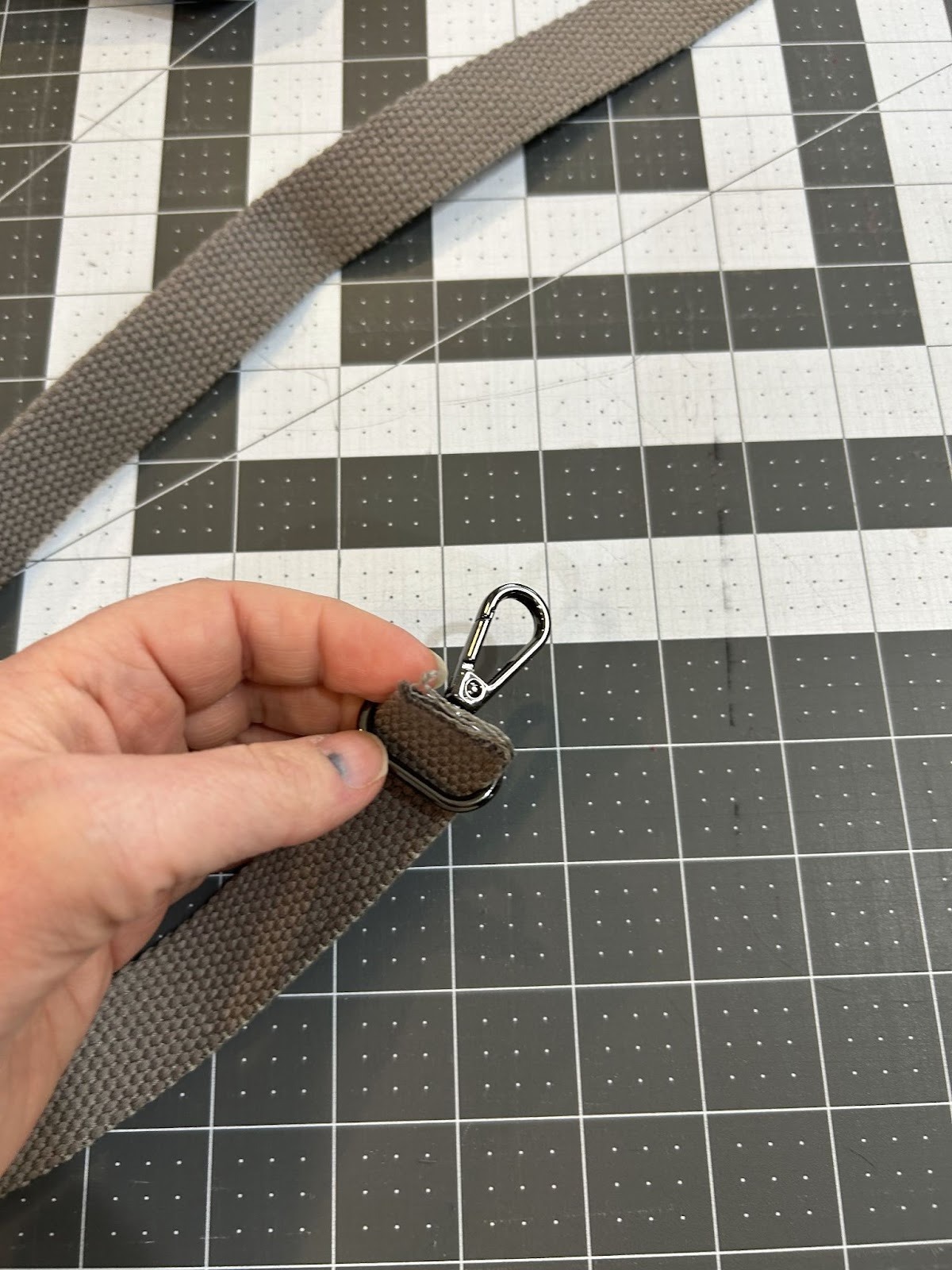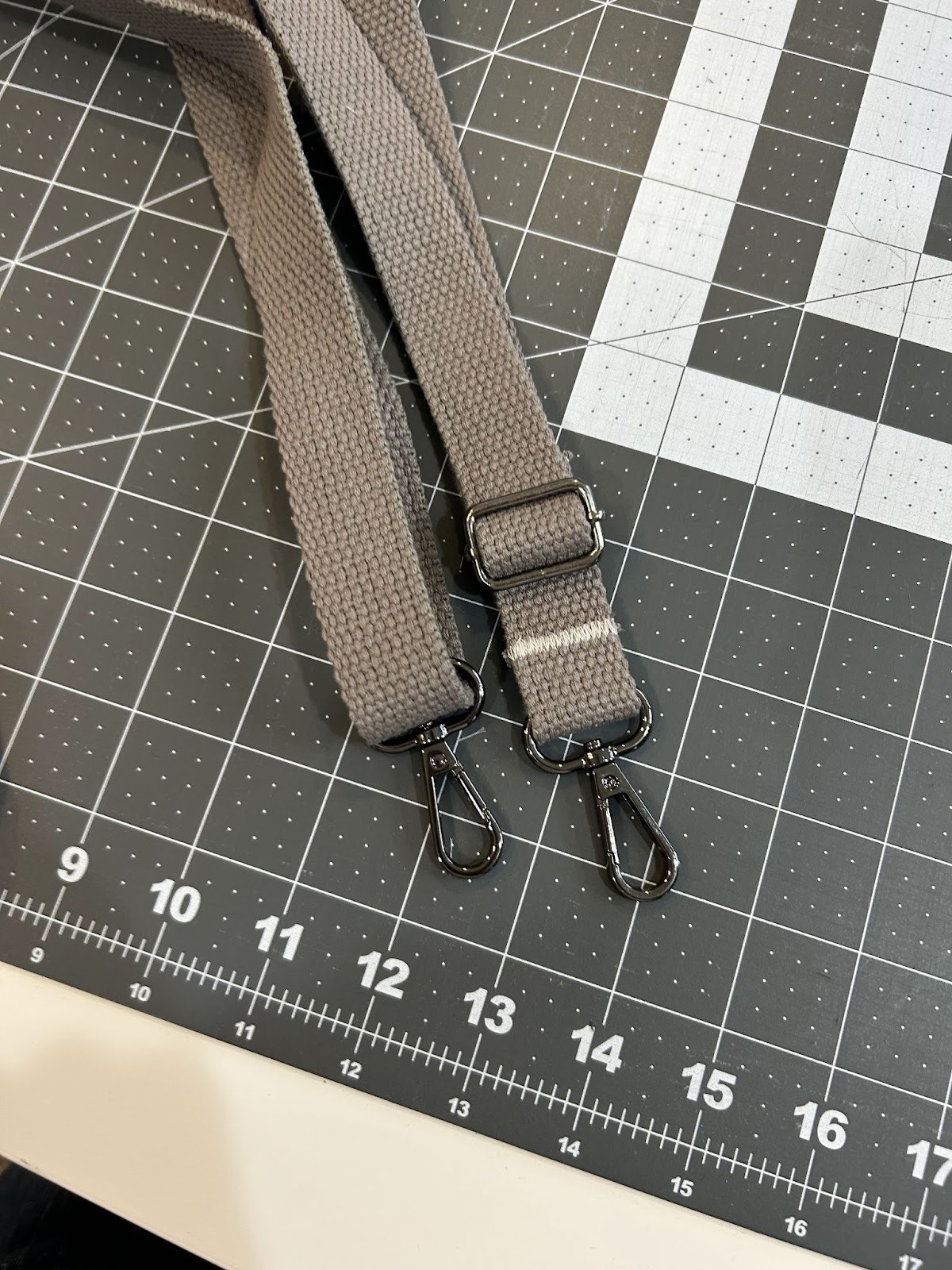 Place the other swivel clasp just at the edge of your strap. My brain thinks that there’s a right side and a wrong side to this, so I make sure that the top of the slide shows at the same time as the “front” of the swivel clasp and the tail tucks behind. I’m not sure there is a “right way” or a “wrong way,” but that’s what looks finished to me!