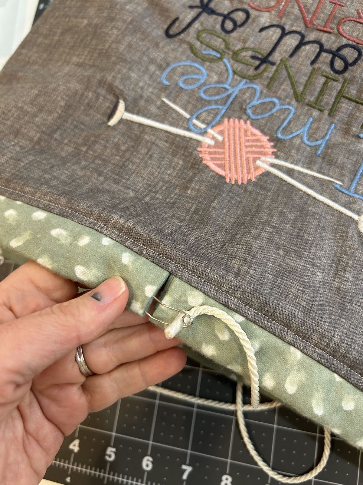 Now we just need to pull the cord through the casing. I like to use a safety pin, but I know there are other gadgets out there to help make it easier. You can use whatever works for you to pull the cord through the casing.