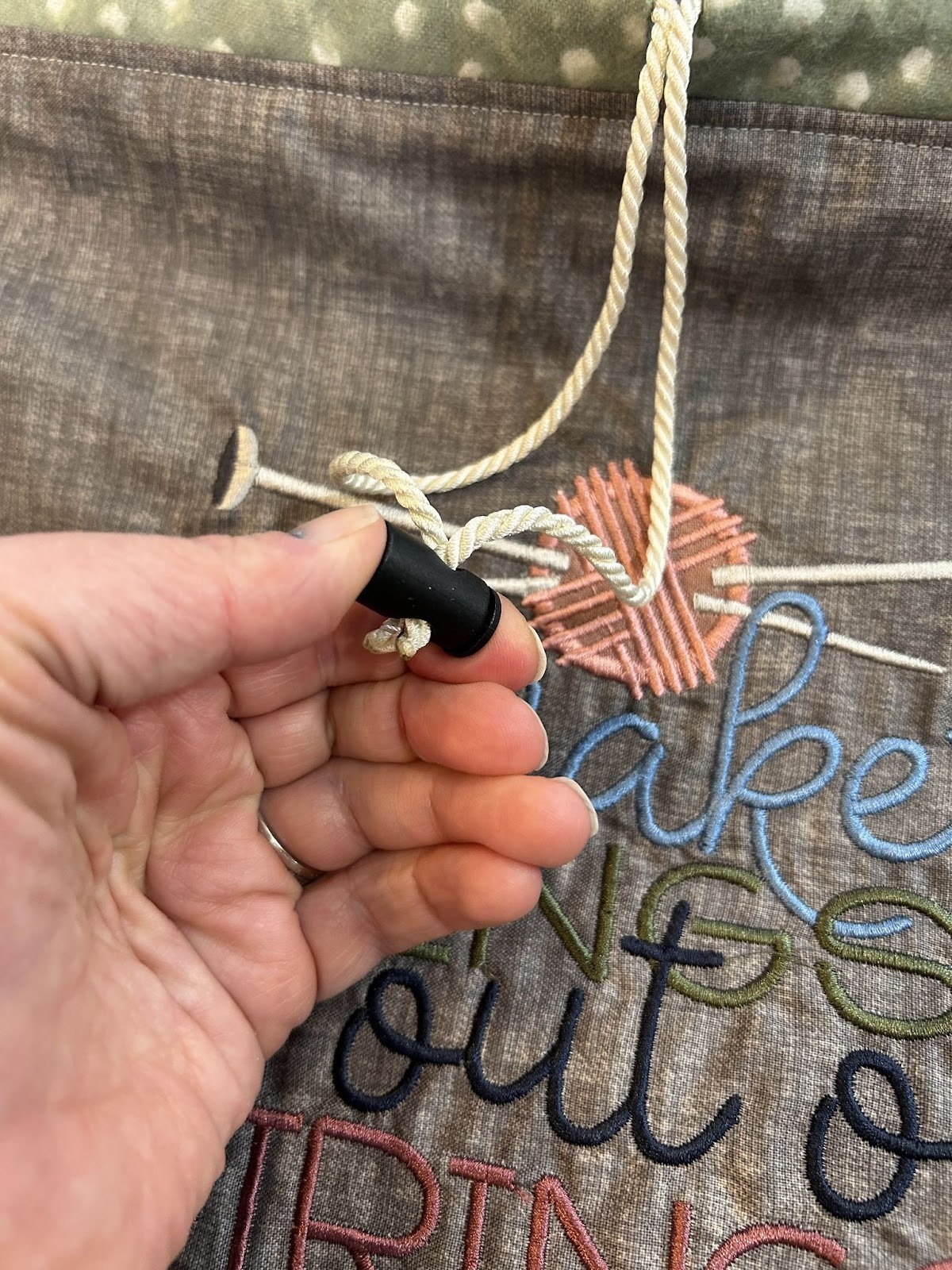 Slide on your cord stop. I like this because it helps keep the bag closed. I still tie a nice bow afterwards but I know it’s not going to inadvertently come open.