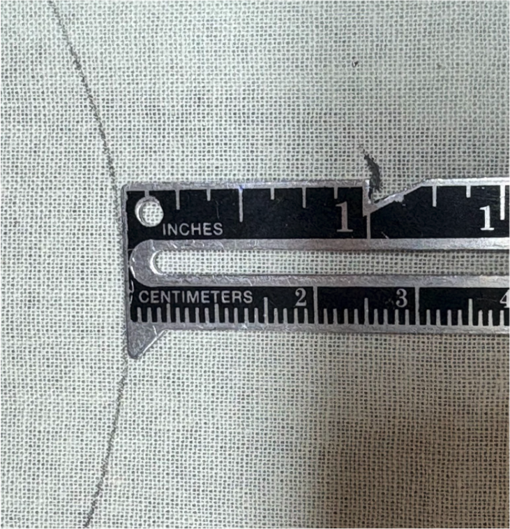 From your 2” mark, measure down until you’re ¾” to 1” from the bottom edge. Mark this lower spot. Between the two marks will be your embroidery area.