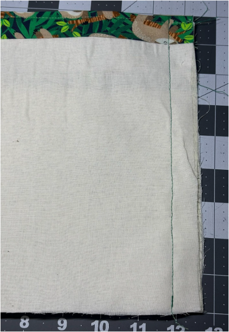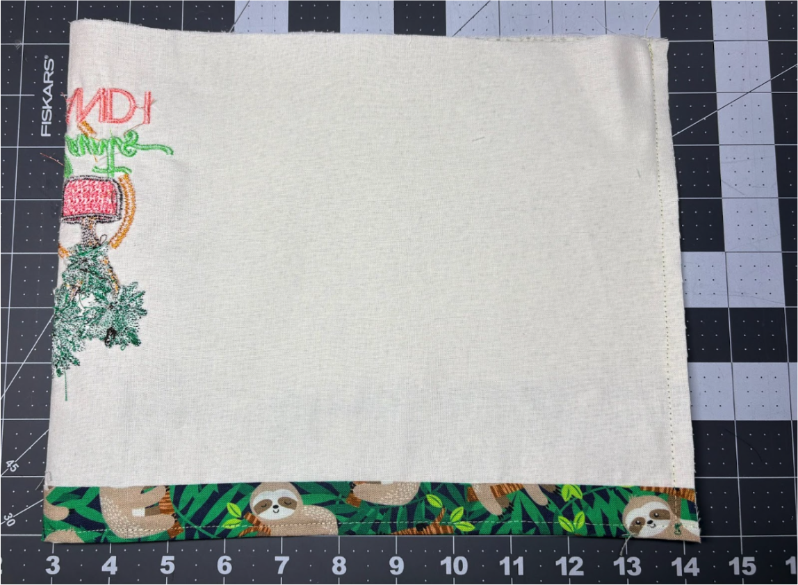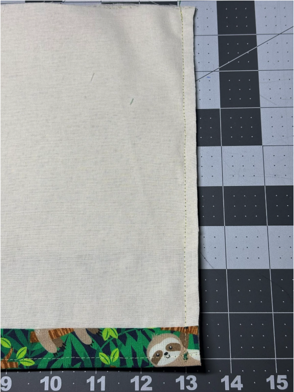 Fold the fabric in half widthwise, matching up the short ends, and pin them together. Baste a ¾” seam along the edge to hold everything in place. A generous seam allowance makes resizing easy. This simple detail lets you adjust the fit as needed, so your finished plant wrap is perfectly sized for your pot.