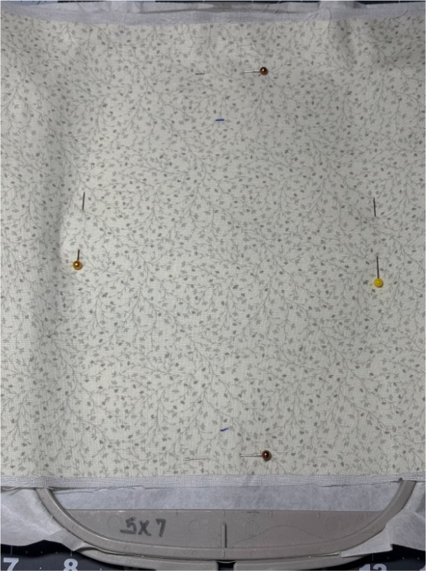 Spray the stabilizer with adhesive. Line up the center top marks on your fabric and stabilizer, smooth out any wrinkles, and pin the fabric away from where you’ll be stitching.