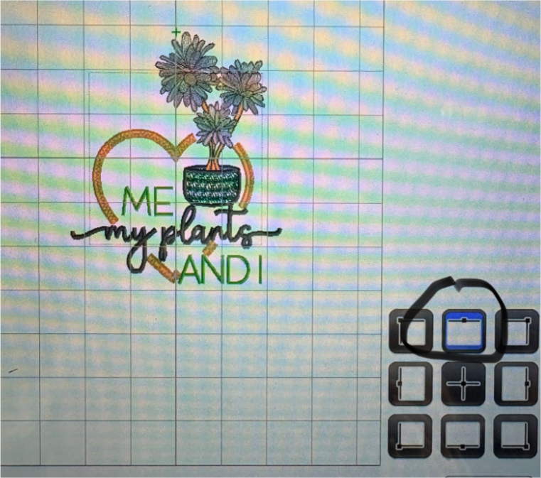 Choose your embroidery design and load it onto your machine. I chose a design from Plant Lovers 9. With your Placement keys, find the top center of your design. My machine is a Brother 8500; your screen may look different.
