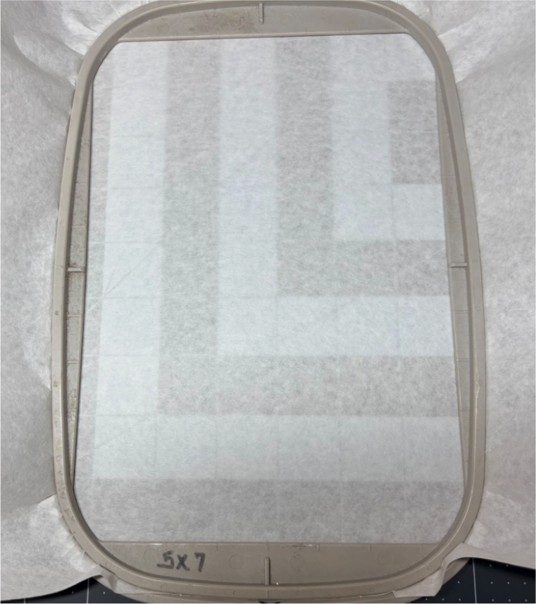 Mark the top center point for your design on the stabilizer. Then, take the hoop off the machine and place it on a flat surface.