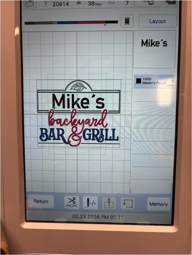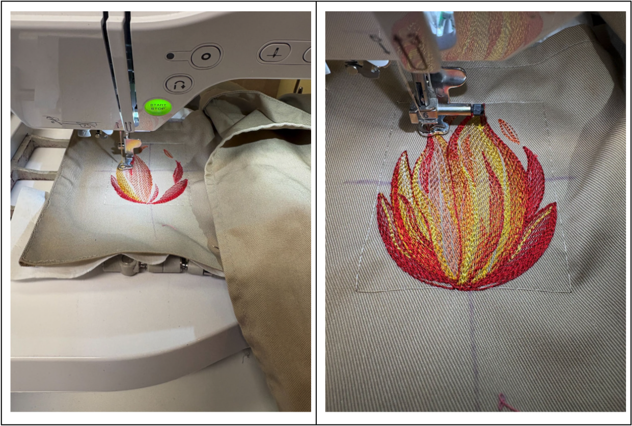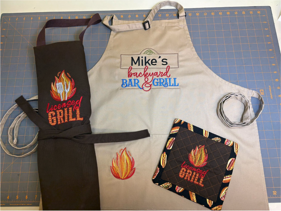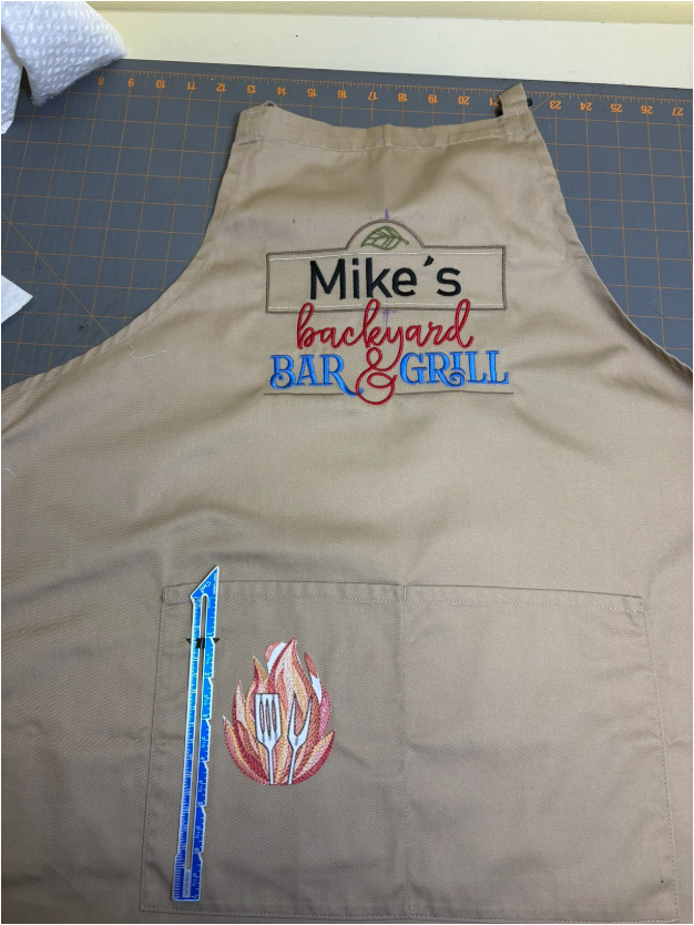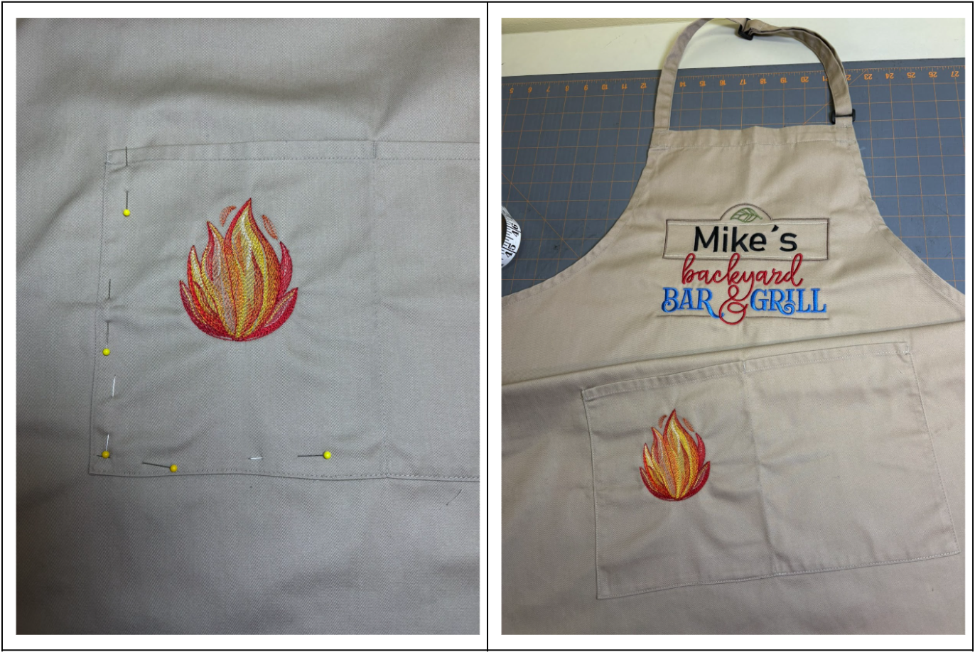 I wanted to use only the flames from the Licensed to Grill design on one of the pockets. I don’t have a printer but, wanting to get the flames the right size, a friend took a screenshot of the design and printed out a couple of sizes. I liked the larger size better. I have a couple of the Embrilliance modules so I was able to delete the words from the design. I reduced the size of the flames so they were 3 1/2” tall x 2 11/16” wide. If you want to stitch out only the flames as I did and you only have the Essentials module, reduce the size of the overall design to 83.7% and only stitch the flames, making sure the top of the design is 1” below the pocket seam or however low you want it placed. If you don’t have software, play with your machine’s setting to reduce the design and check the sewing area.