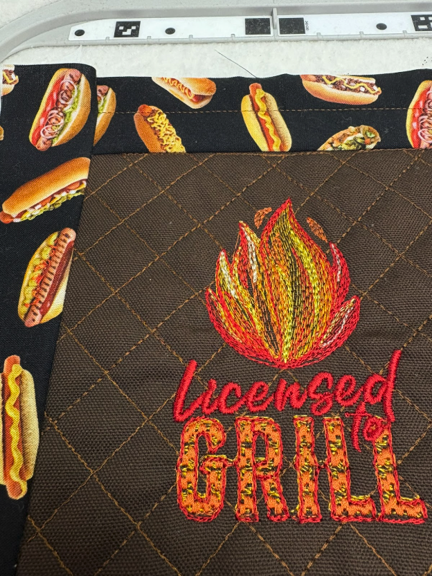 When I made this Father’s Day pot holder, I skipped the utensils part of the design but included the words Licensed to Grill. I made the center of the pot holder with the same duck cloth I used for the barbecue tool holder. Make sure to follow the suggestions for changing thread colors. My pot holder pulled more than I’ve seen before; I think this was because I was using a scrap of batting that was on the thin side. Lesson learned and a heads-up for other embroiderers.