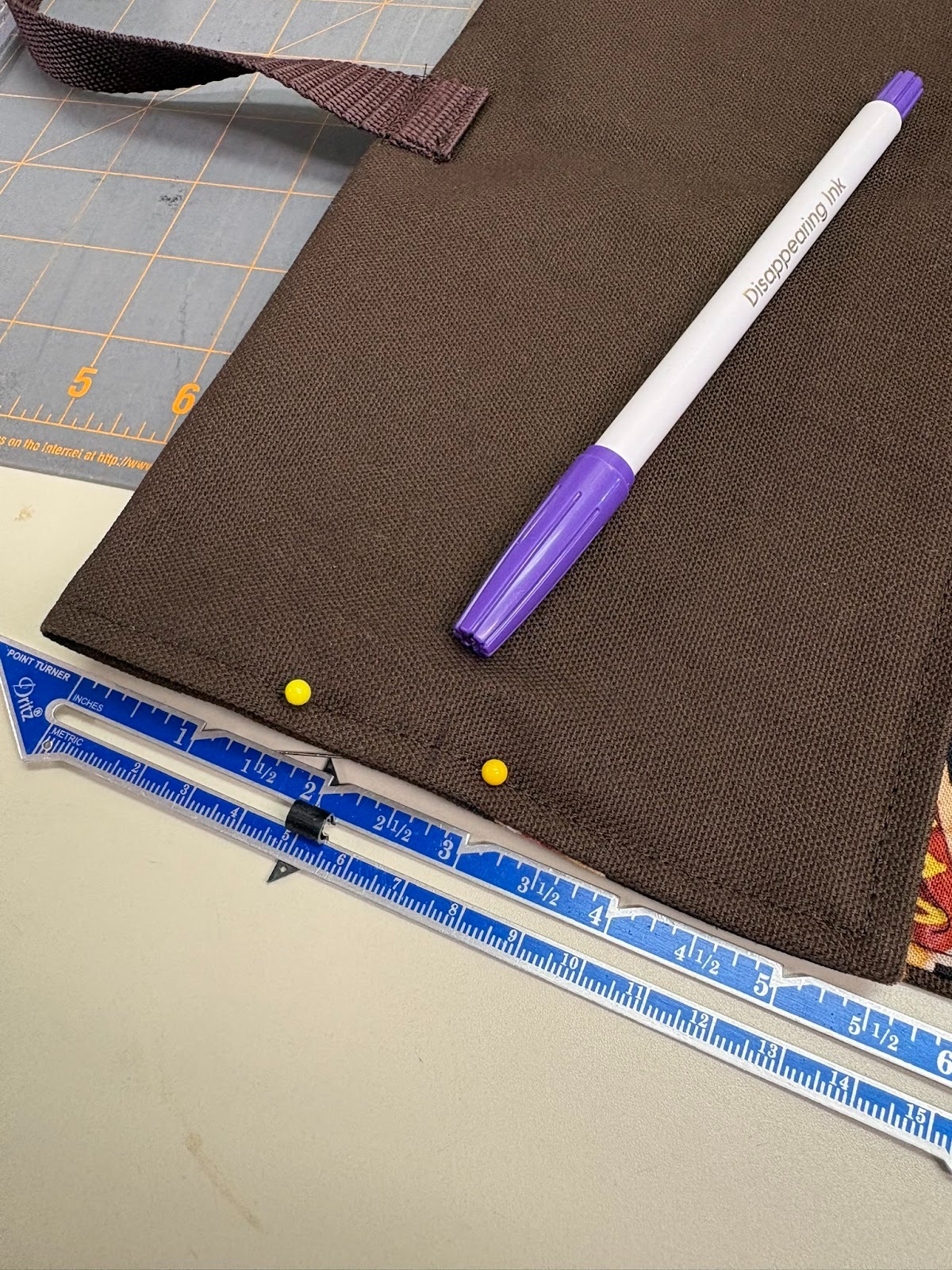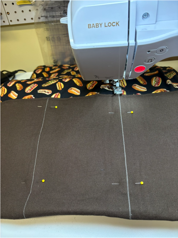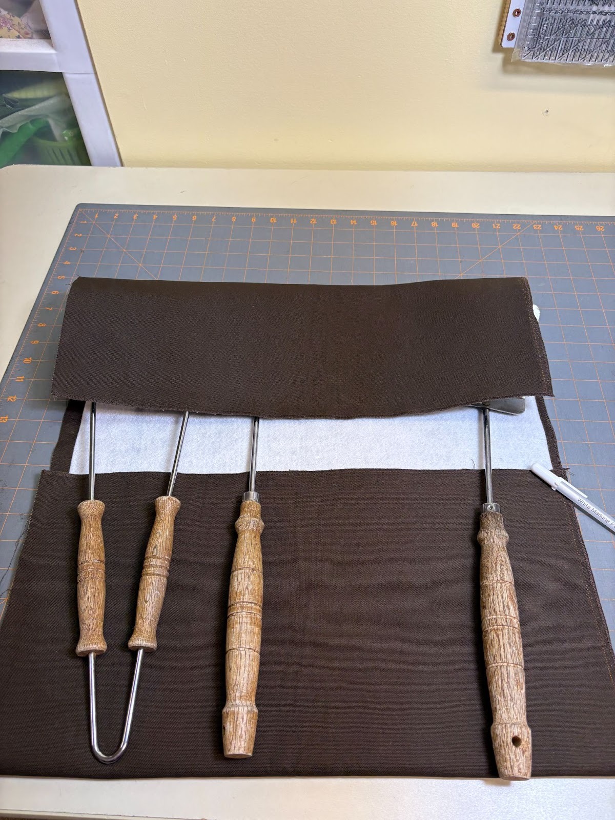 Now it was time to make the pockets. I folded up the bottom part of the organizer 9”, and pinned and topstitched the sides, stitching right on top of the previous topstitching. I made sure to backstitch at the beginning and end. Next I divided the organizer into three pockets. I used one of my large rulers as a right angle ruler to draw straight lines down to follow for stitching. The pockets are pretty big, especially for two of the barbeque tools. You might have noticed that the tools in the photos are not the shiniest things anymore. I asked my husband if he wanted new ones, but he said no. I might surprise him with new ones anyway when Father’s Day really does arrive. If I decide to do that, I’ll probably go back and subdivide one or two of the pockets, depending on the tool set I purchase.