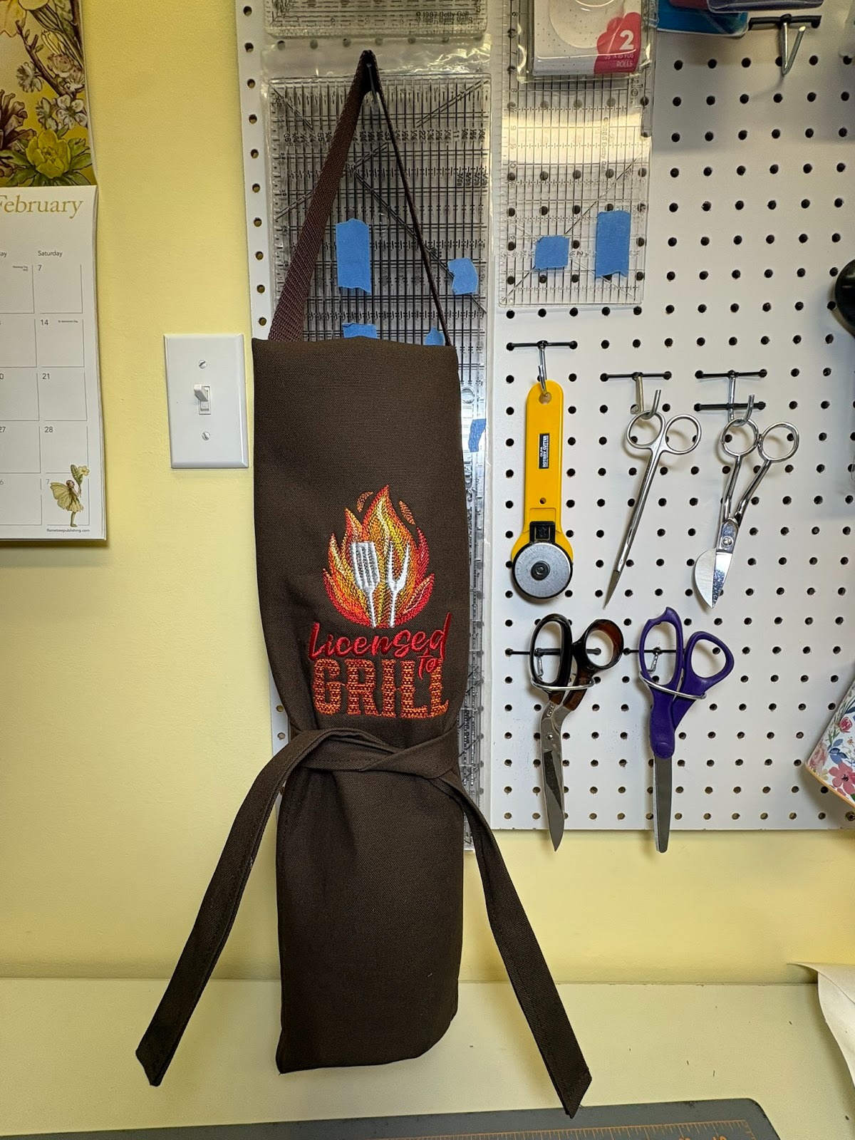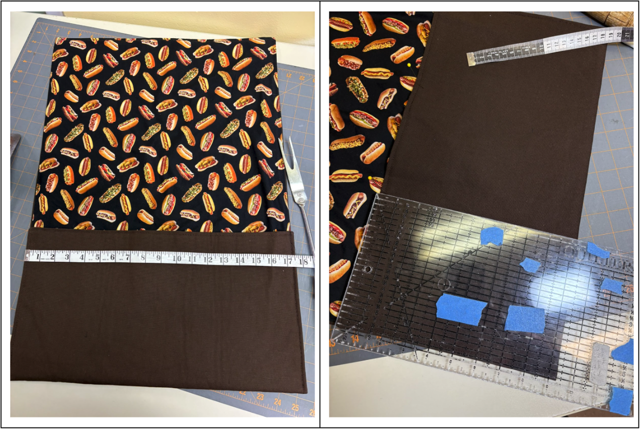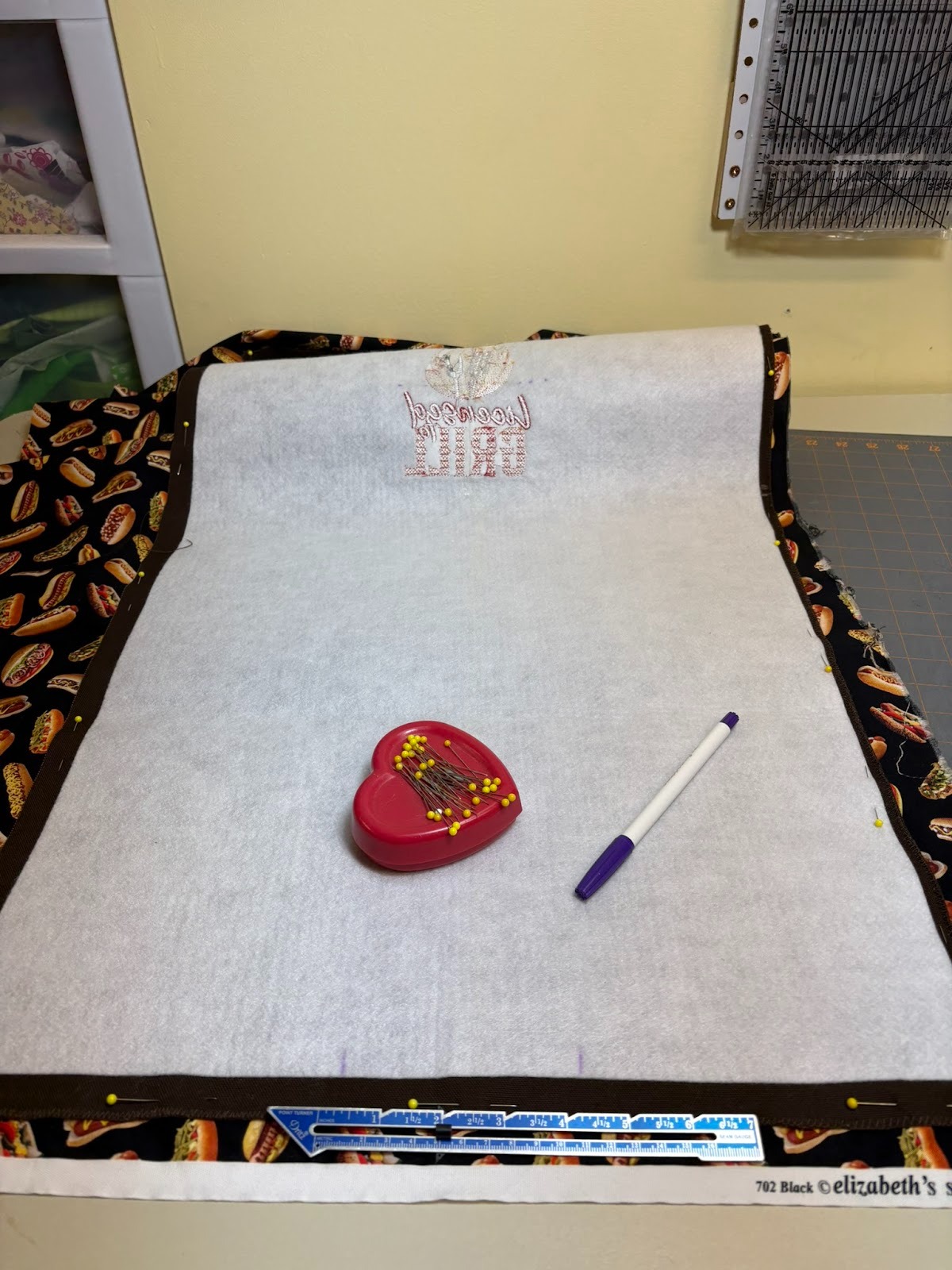 Wanting to coordinate everything, I needed to figure out where I was going to embroider the Licensed to Grill design, because that needed to be embroidered before the lining was added. The organizer will be in thirds when closed, like a kitchen towel when you display it from the oven handle. I folded up the bottom part of the organizer 9½” inches.The pockets will be 9” after the lining is added. I also folded the top down.