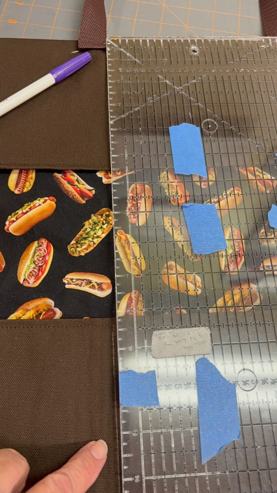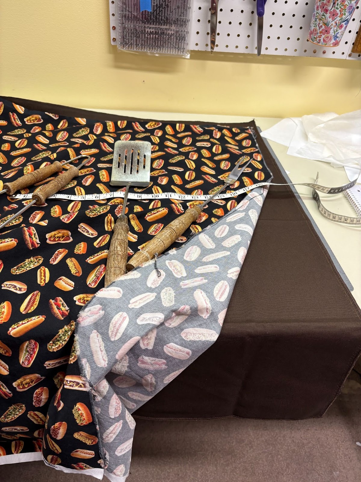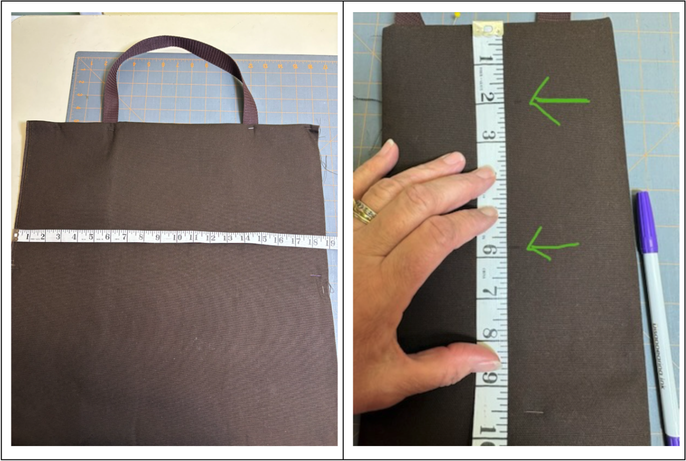 Wanting to coordinate everything, I needed to figure out where I was going to embroider the Licensed to Grill design, because that needed to be embroidered before the lining was added. The organizer will be in thirds when closed, like a kitchen towel when you display it from the oven handle. I folded up the bottom part of the organizer 9½” inches.The pockets will be 9” after the lining is added. I also folded the top down.