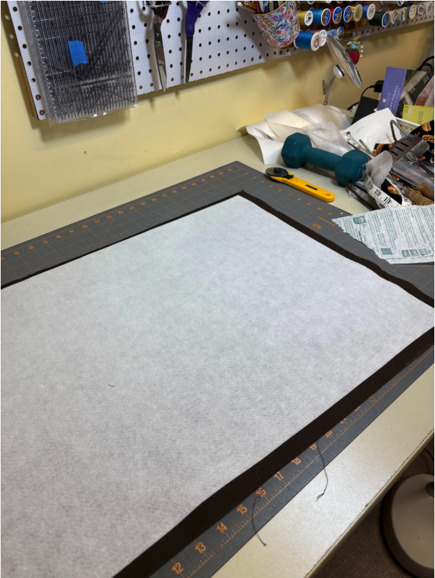 To take advantage of the amount of canvas that I had and make less cutting work for myself, I decided to make deep pockets and an overlapping top which would hold the tools more securely. I cut out a rectangle 36” x 19”, which meant I only made one cut of the canvas. Next, I cut a 35” x 18” rectangle from fusible fleece and fused it to the wrong side of the fabric.