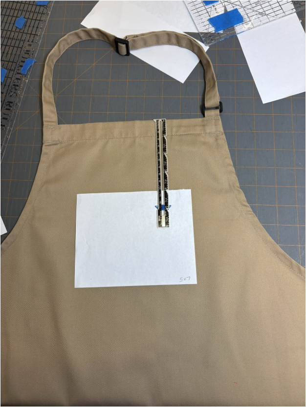 I used the Bar & Grill design for the bib front of the apron.One of the first things I had to determine was the size of the embroidery. I cut out a 5x7 rectangle and a 6x10 one and laid them on top of the apron, 4” from the top edge. Because the larger size looked more appropriate for the space, that’s the size I chose.