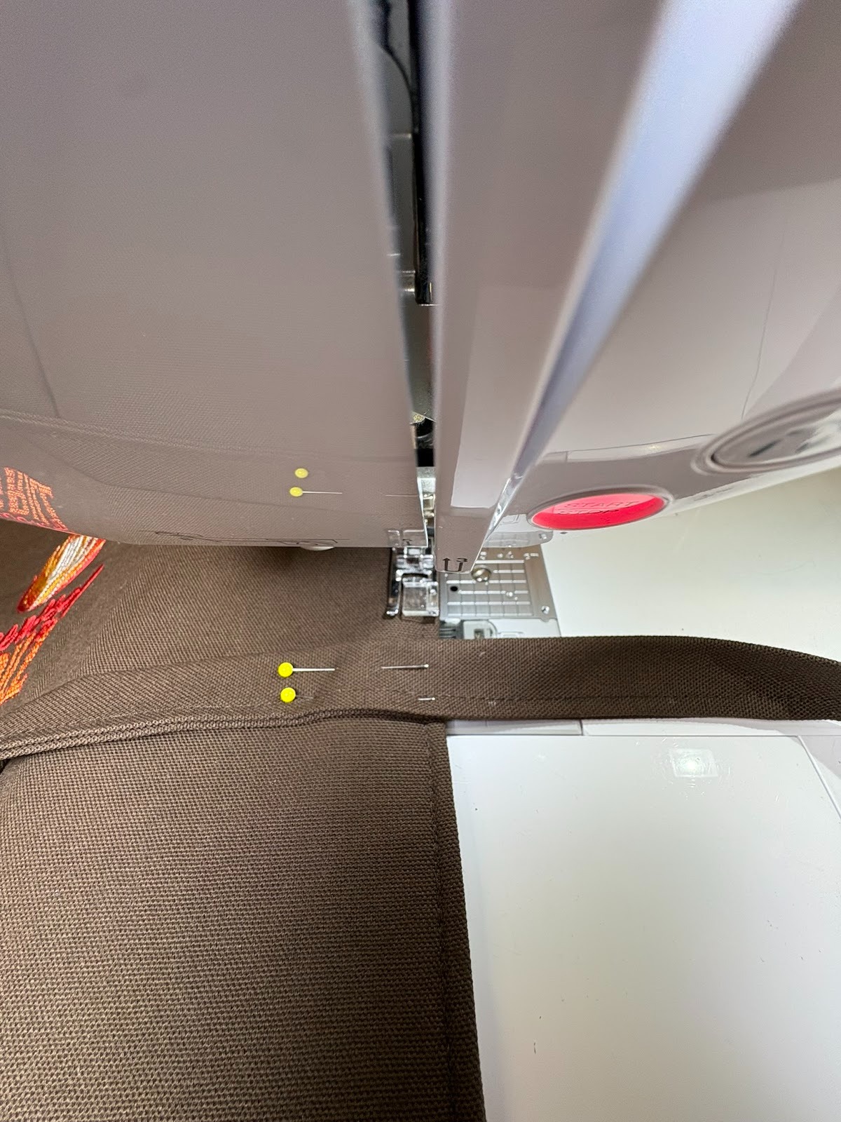 The last step was to make a tie to keep the organizer closed. I folded the organizer in thirds along the pocket lines, then tied my tape measure around the closed organizer to see how long it should be. Next, I cut a rectangle 2½” x 32” After folding and pressing each long edge in ¼”, I folded and pressed the whole tie in half and topstitched it. Since the embroidered side is the front of the organizer, I wanted the tie to be secured from the back. I folded the organizer closed and turned it so the front was facing me. Then I laid the tie underneath (almost like I was getting ready to wrap a present). Carefully keeping the organizer folded and the tie exactly where it was, I flipped the organizer over and pinned the tie in place. The very last step was to machine sew the tie at the outer edges of the organizer. I made two lines of stitching to keep it in place.