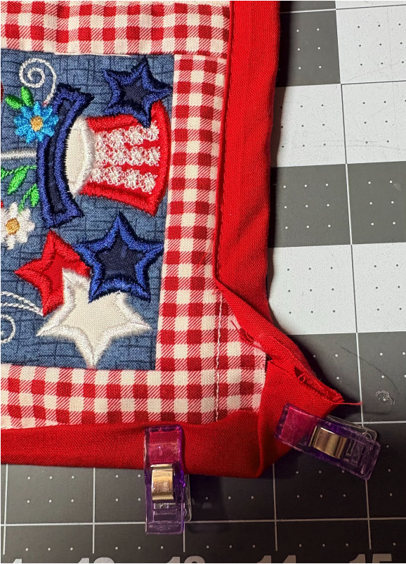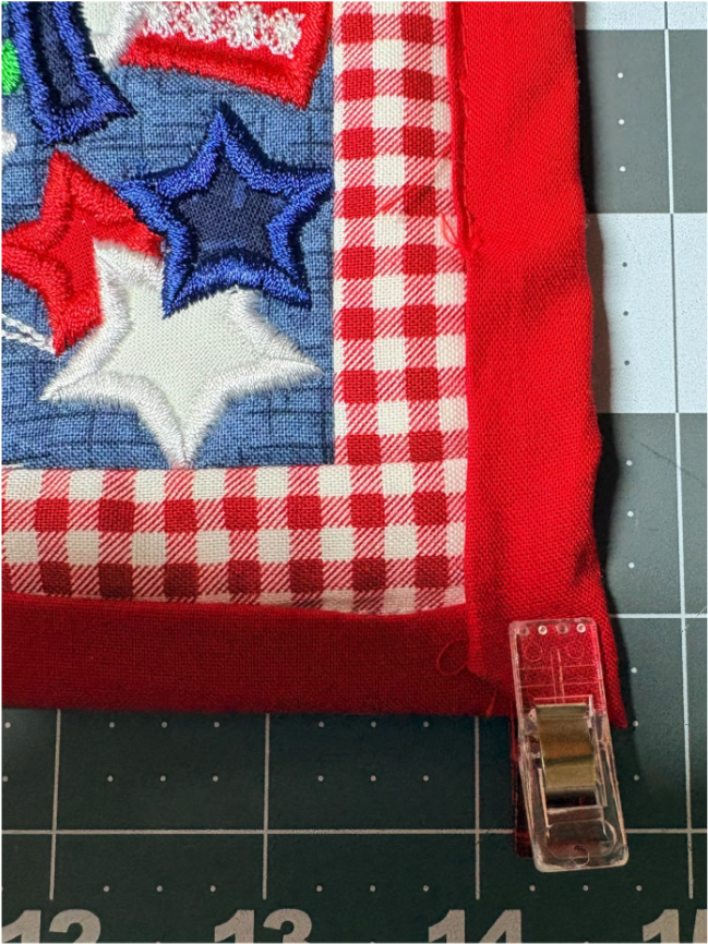 Center the topper on the backing fabric. Fold the pressed edges over the front, and pin or clip them in place, ensure the folded edge stays turned under and lines up with the stitch lines on the blocks.