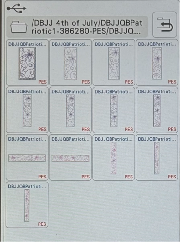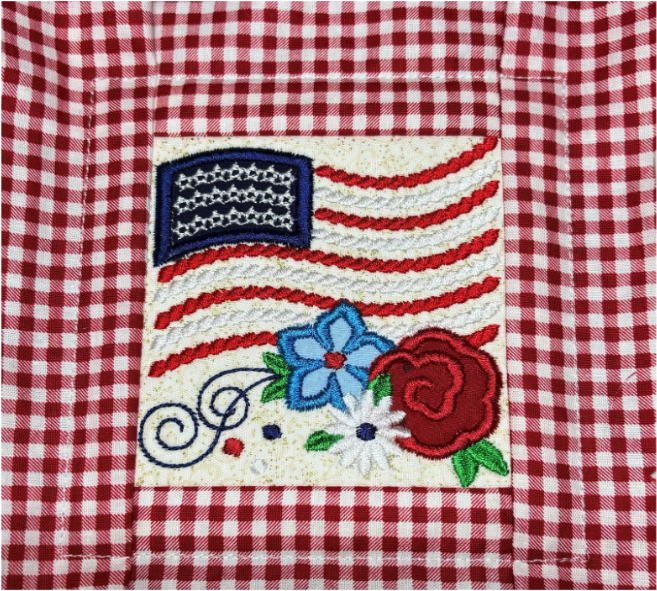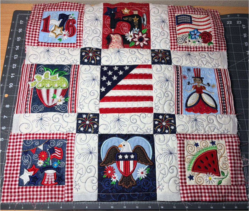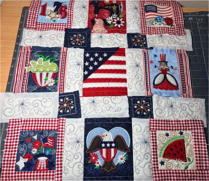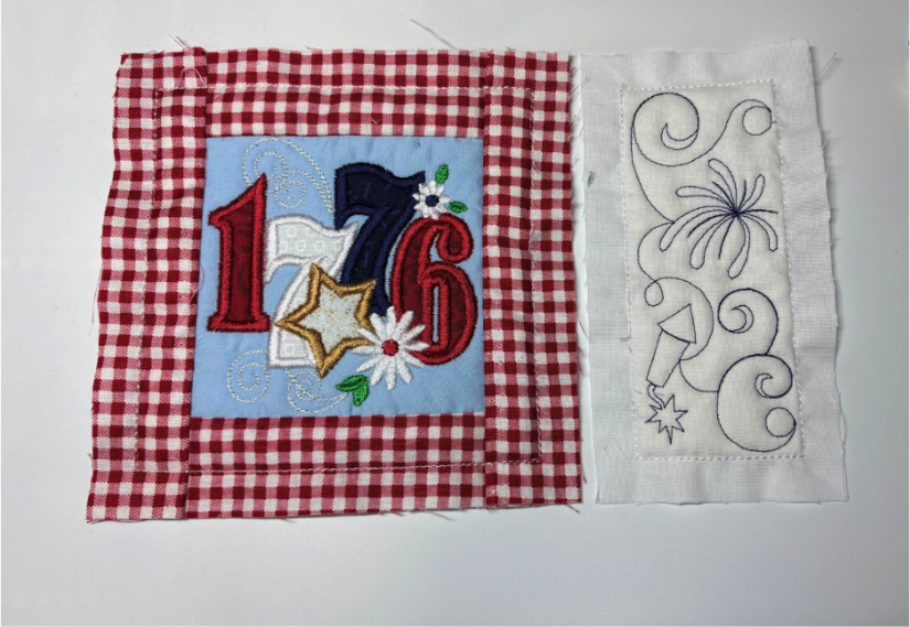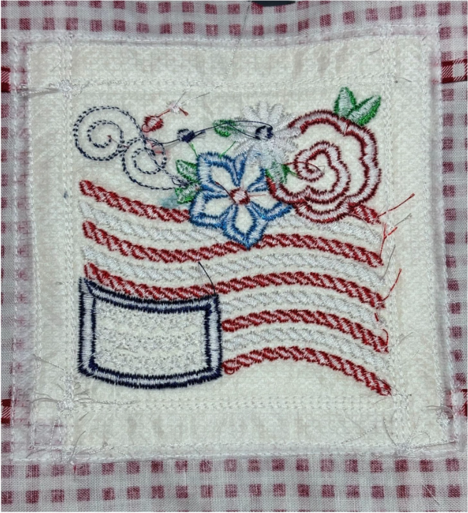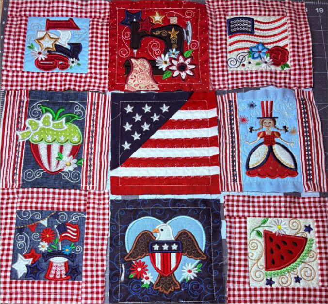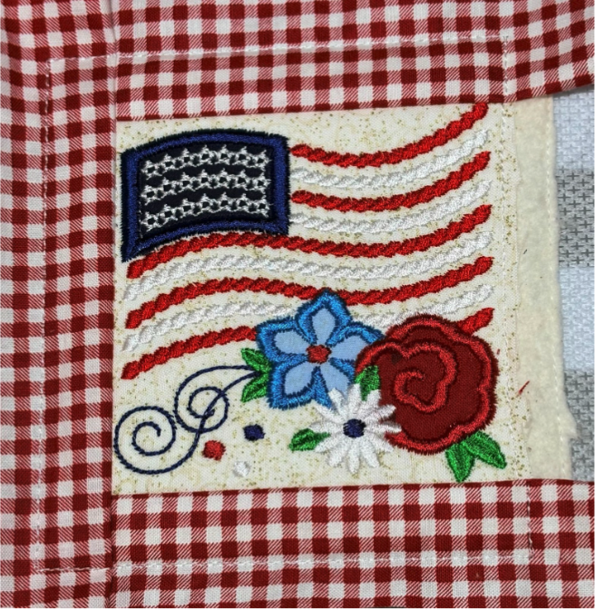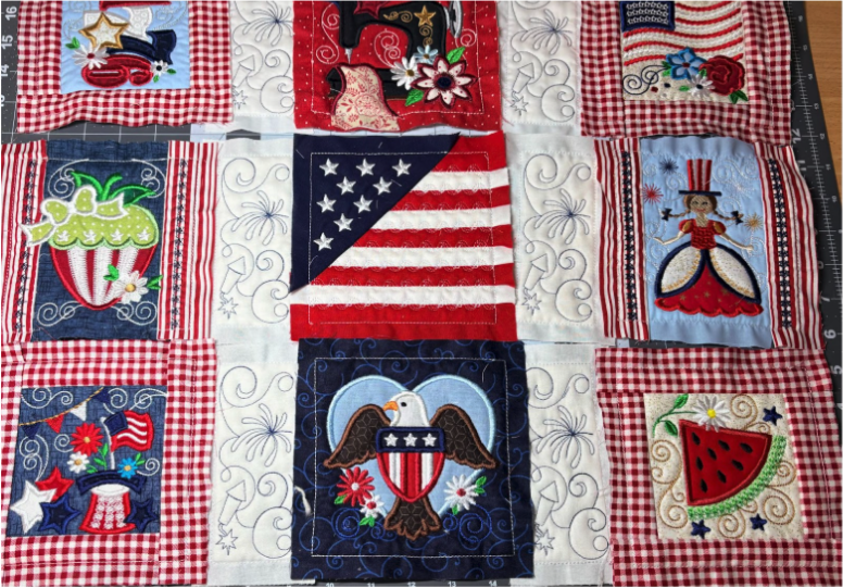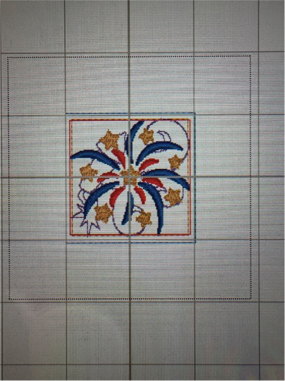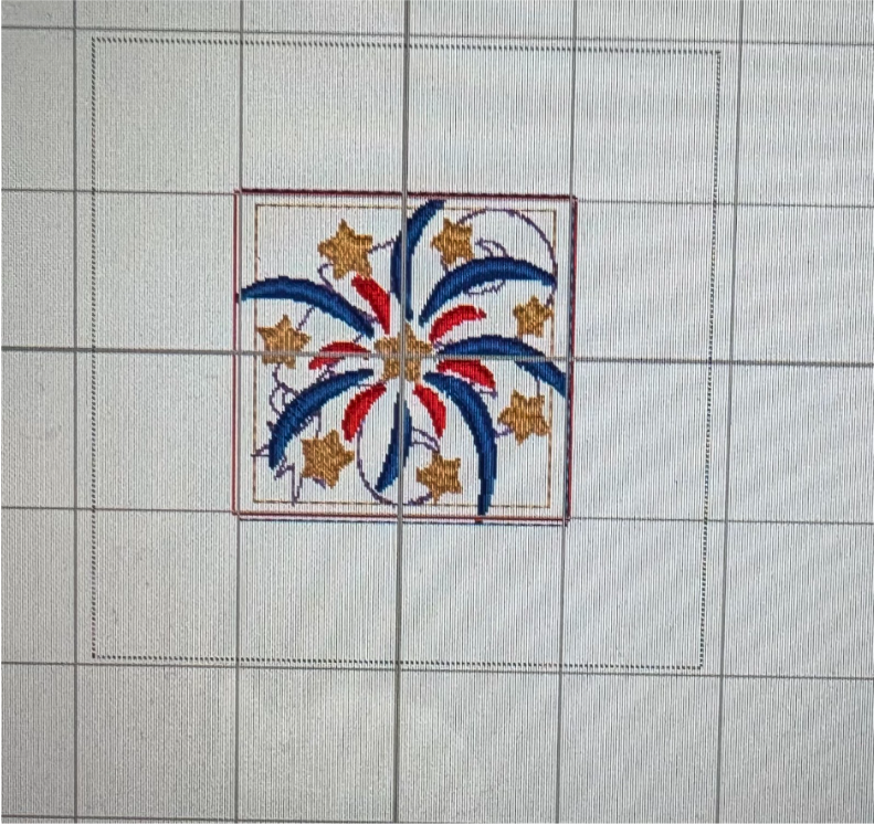To add the 2” blocks, load them from the Quilting Backdrops files. You can choose to stitch out the block as shown or add a design from the Daisy Doodle Patriotic Bean Stitch Applique Embellishment Set, as I did.