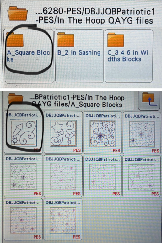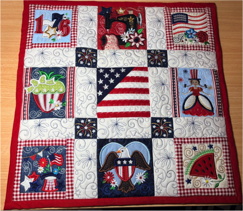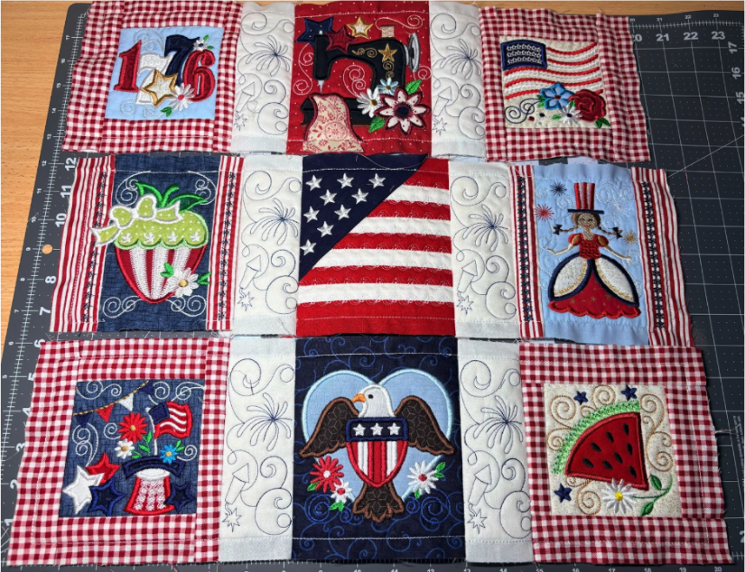 Load the designs onto your machine. For this project, I’m using the Star Spangled Stitches Set 1. This design set has nine blocks in multiple sizes. We will want to complete all nine blocks for our table topper.