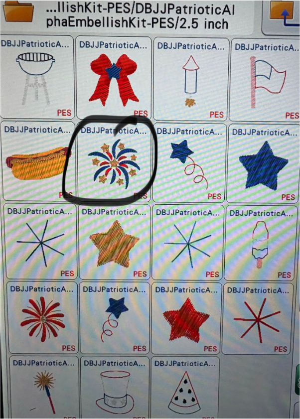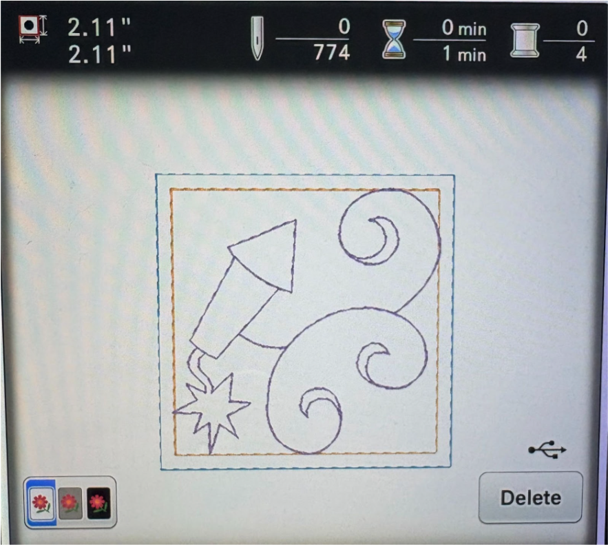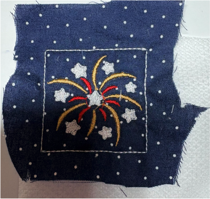 When you come to the original firework design, do not stitch the original design, but advance to the Embellishment Kit design. Follow the steps to stitch the firework design.