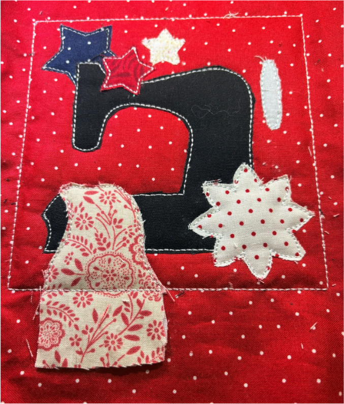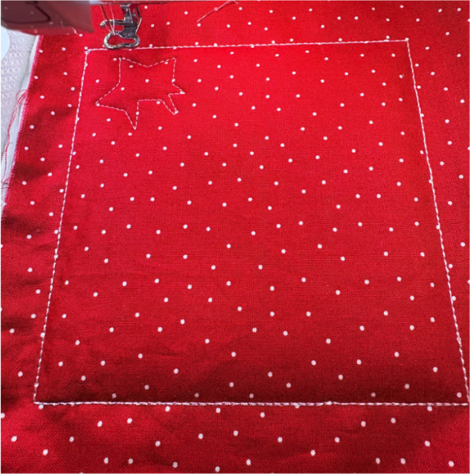 Sew the next step, which is the placement line for the blue section of the flag. Place the fabric right side down and sew the tack-down stitch.