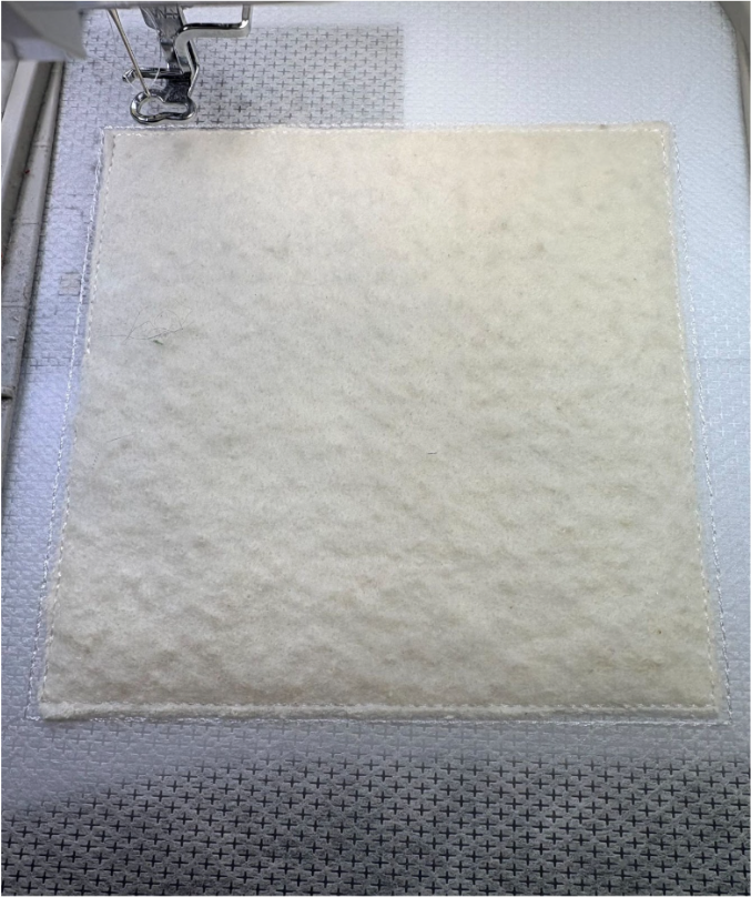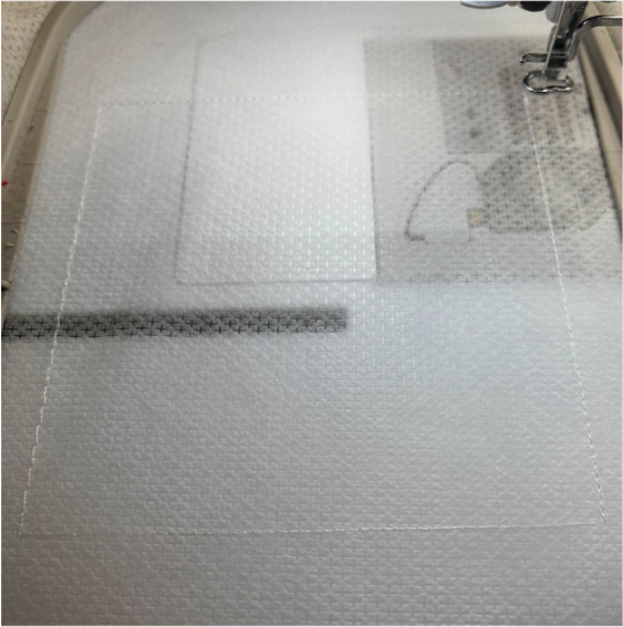 Hoop cut-away stabilizer and take it to your machine. Run the first step, the placement line for your batting.