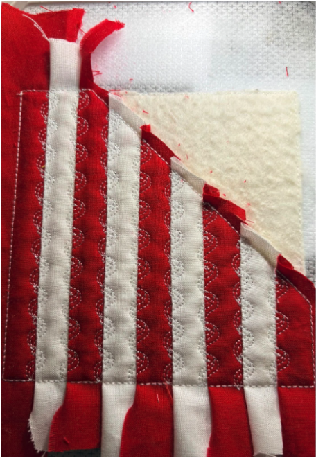 The stripes will get shorter as you go, but always make sure at least ½” of fabric overlaps the batting.