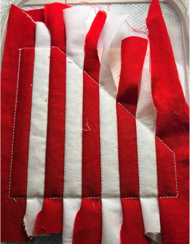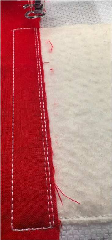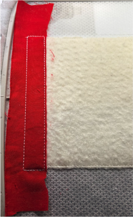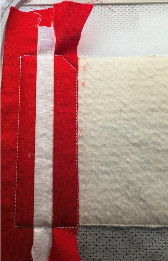 Place the fabric strip right side up over the stitches, ensuring there is at least ½” extra on the top, bottom, and sides. Sew the next step, which is the tack-down stitch. Trim the fabric close to the stitches along the inside edge only.