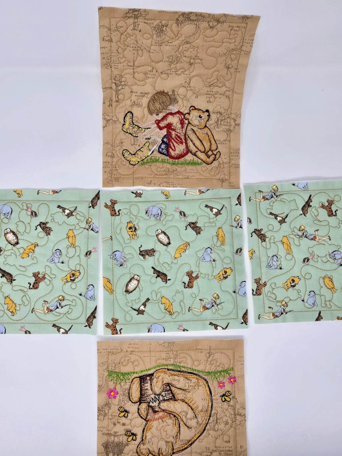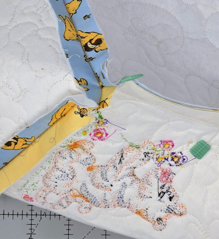 I started by using 6” designs for the characters, but as you can see below, Pooh was a bit too big. I will lose a bit of each flower when I sew the sides together. I still really like it, but I need to remember when a design is standing upright, like Piglet, to use the 4x4 designs.