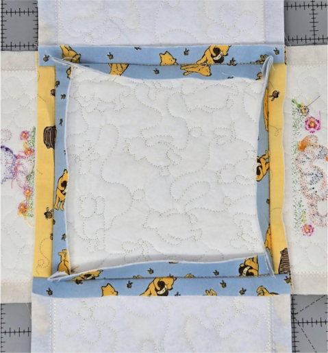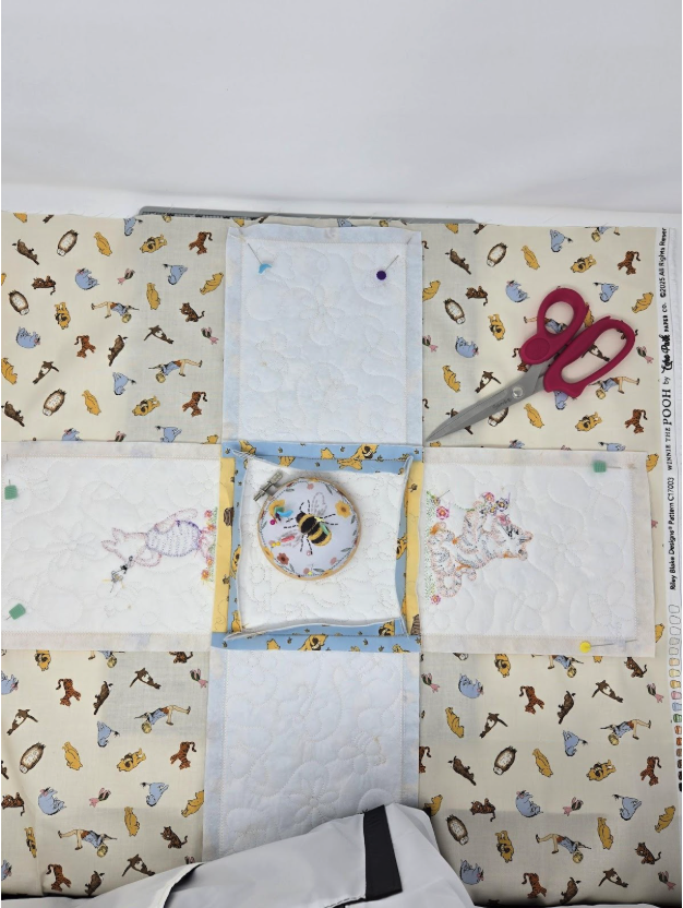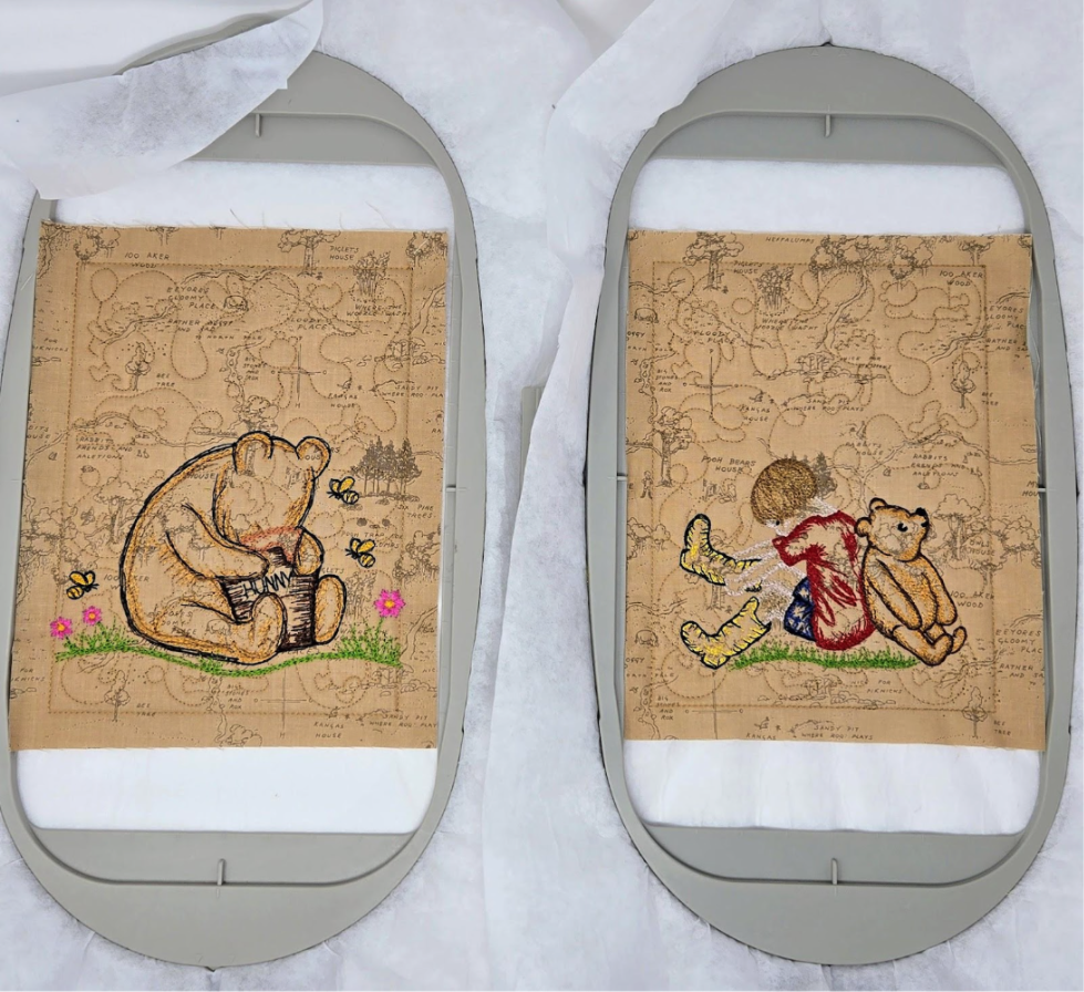 Here’s the process: You will embroider a placement line for the batting, tack it down and trim it, then place your fabric over the top and tack that down. Then, I ran the QB. I chose a vertical design so Winnie-the-Pooh would be standing upright. Without removing the design from my hoop, I went back and loaded the character design I wanted.