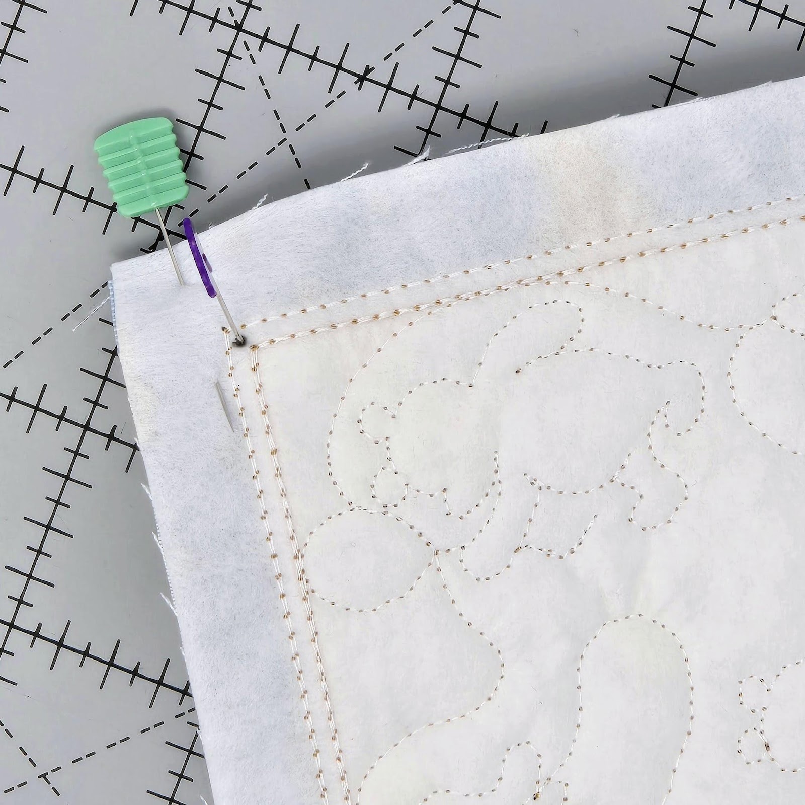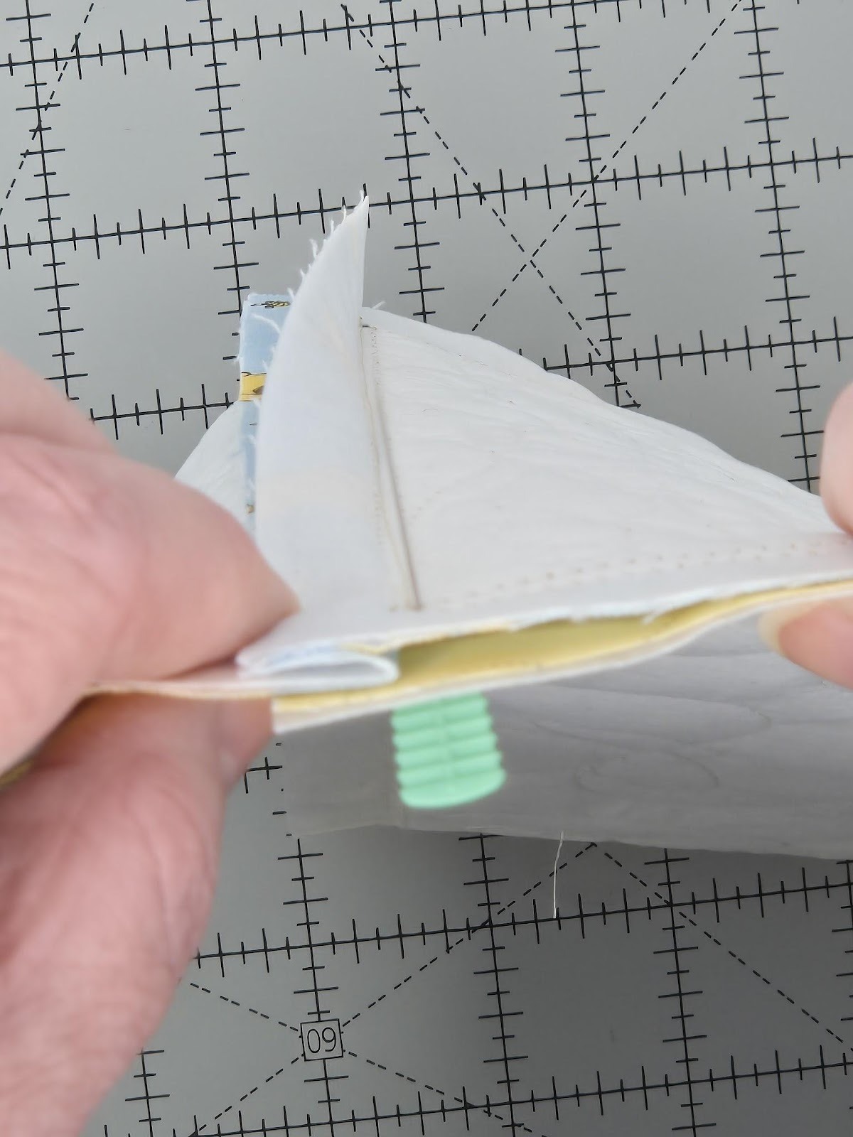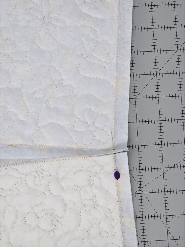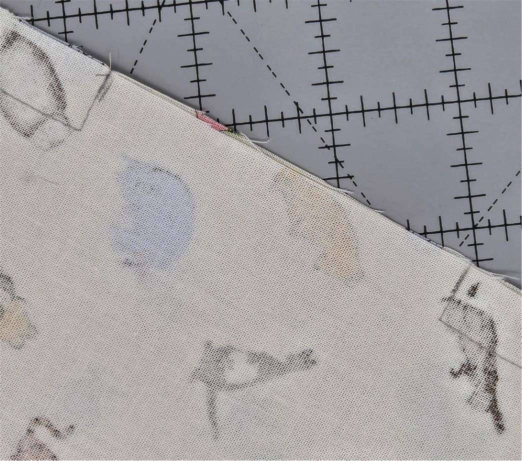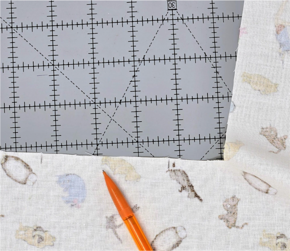 Flip over the bottom square and one side rectangle. Make a mark in the center of the seam between the placement and tack-down stitches at each corner. I used a pencil so you can see it.