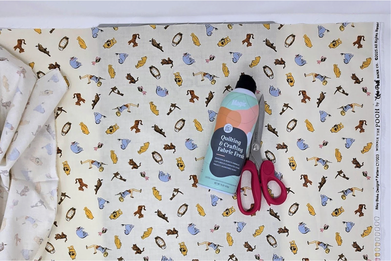 Now we are going to cut our lining. Press your lining fabric well. I really like to use Magic® Quilting & Crafting Fabric Fresh to get the wrinkles and fold lines out of my fabric. Give the fabric a light spray, let it sit a minute, and then press. The wrinkles start to disappear before you even start pressing!