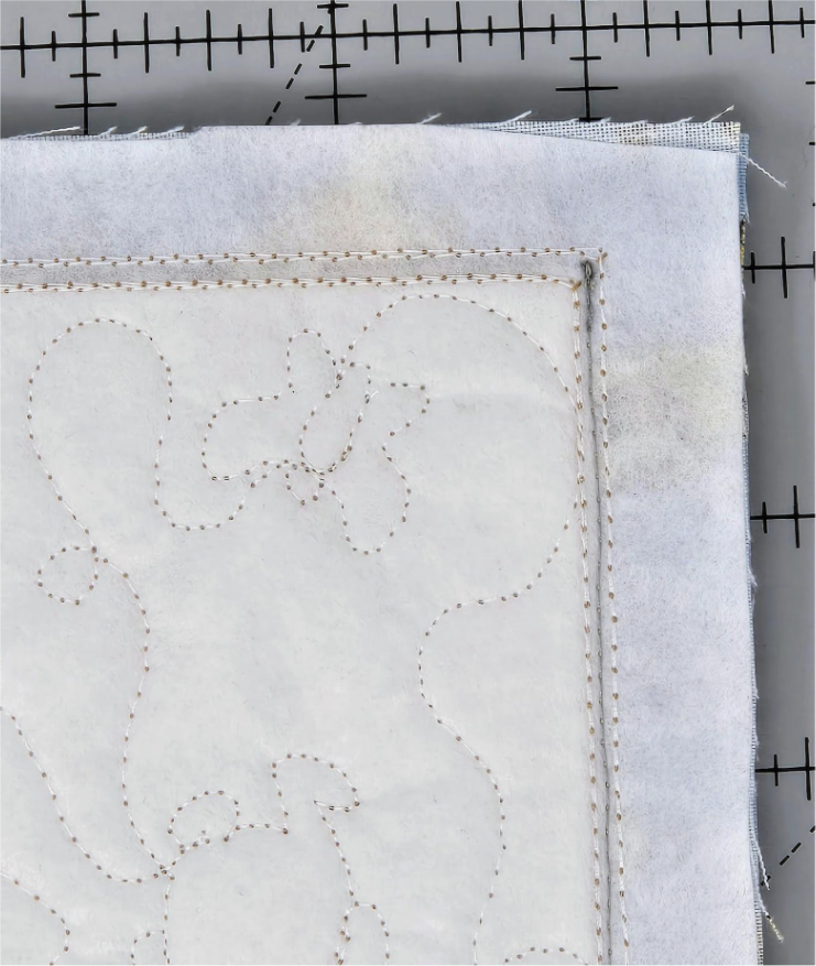 Sew all the way around the top between the placement and tack-down lines on your basket. Press the lining fabric away from the seam and trim the outside (basket) fabric to ¼”.