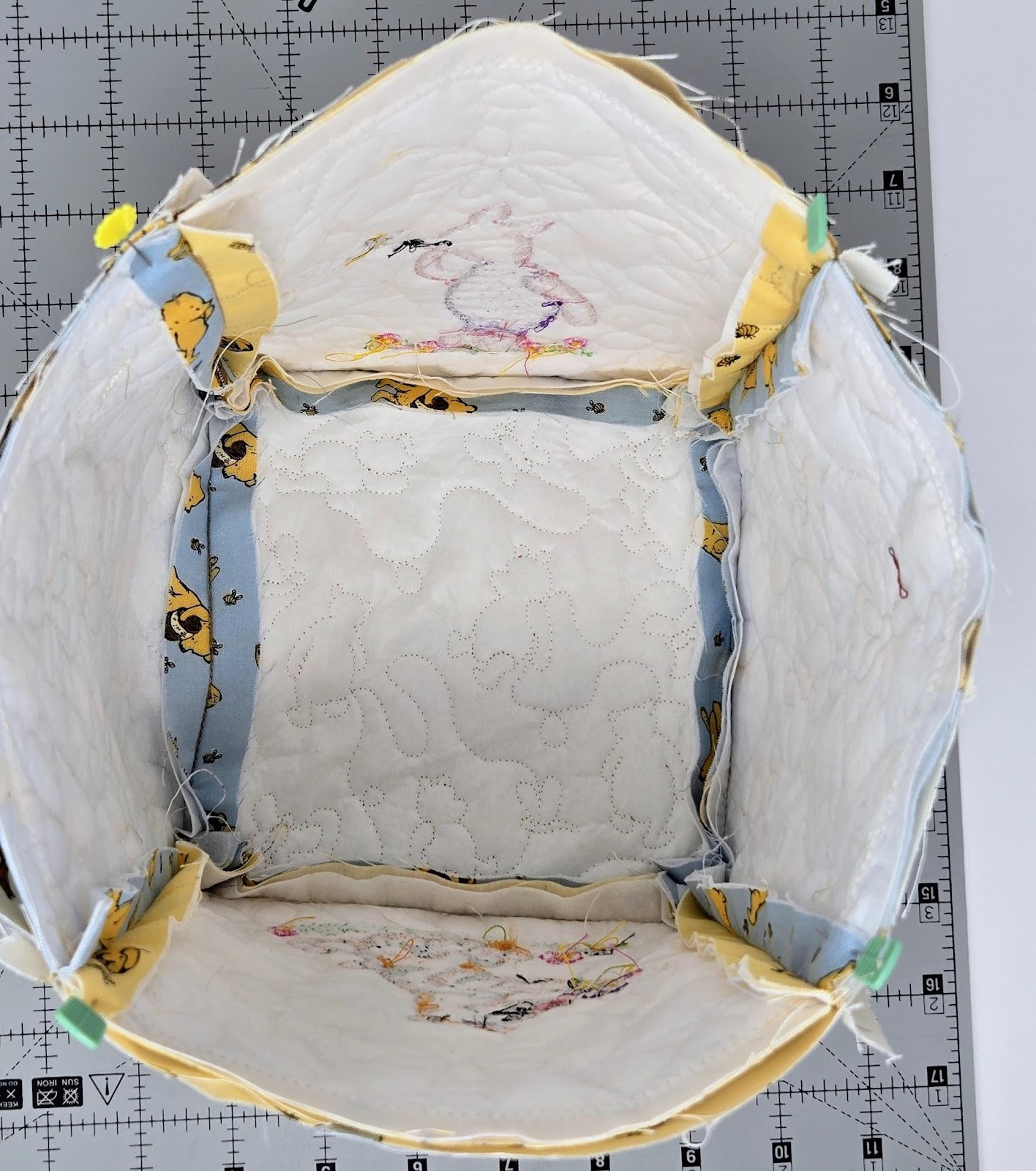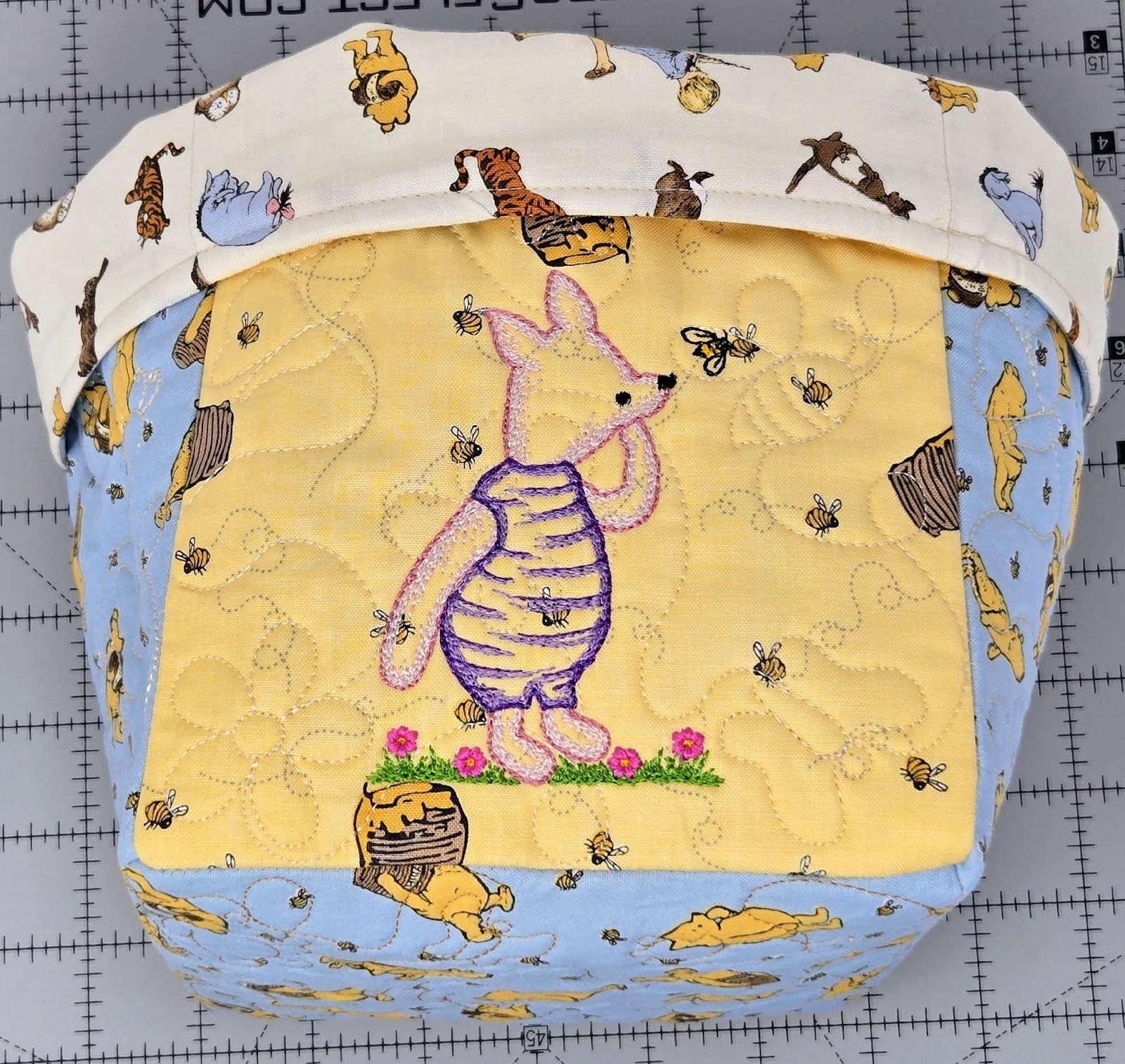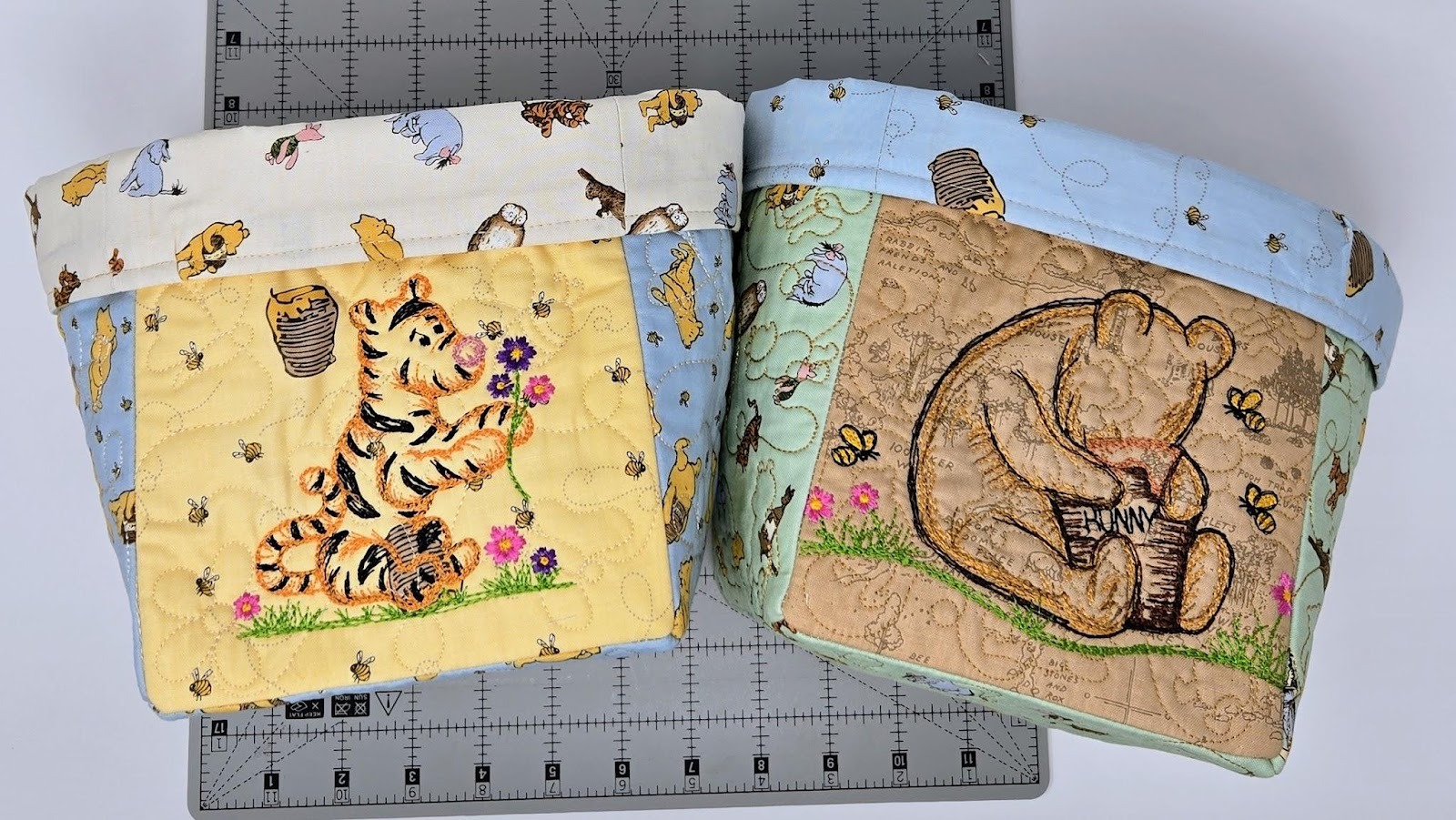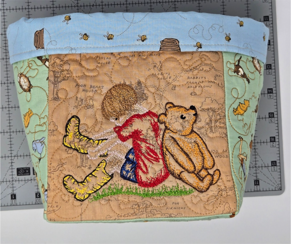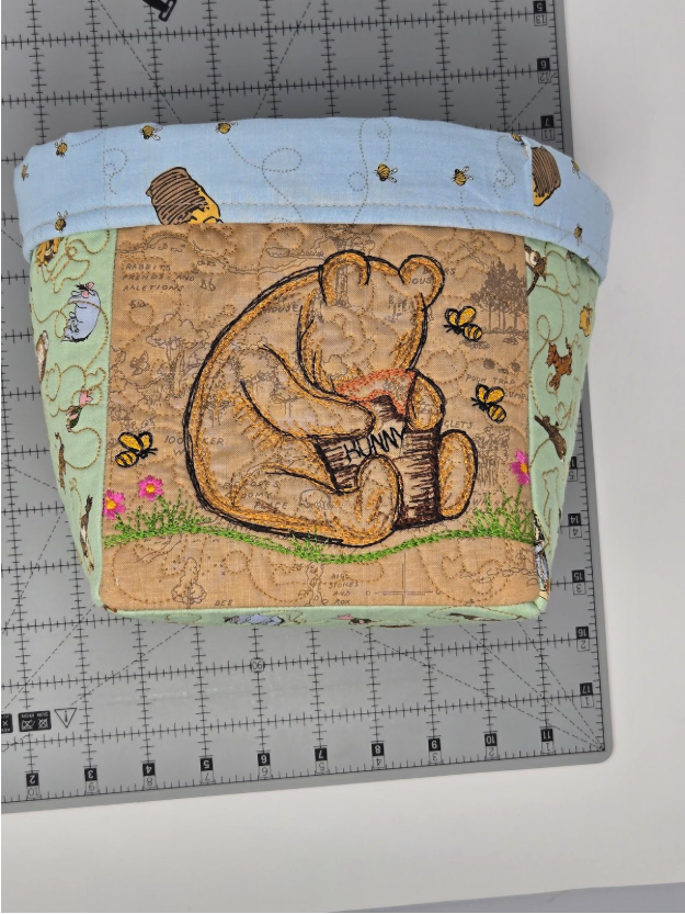 For the other two sides of the baskets and the bottom, I used cutEZ, batting, and the QB. I quilted the QB once on the bottom using the 6x6 square design, but twice for the two sides that only have the quilting. It's very easy to do this—simply back up a step and run the quilting a second time. Now it looks like you used a heavier thread without using a heavier thread. And the quilting really stands out more. Can you see the difference in the photo below? Look for Pooh.