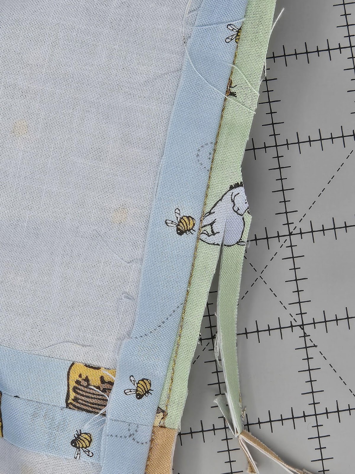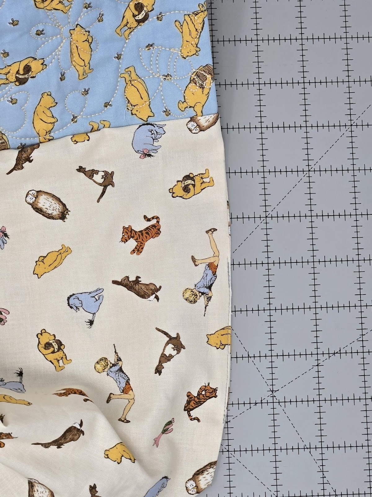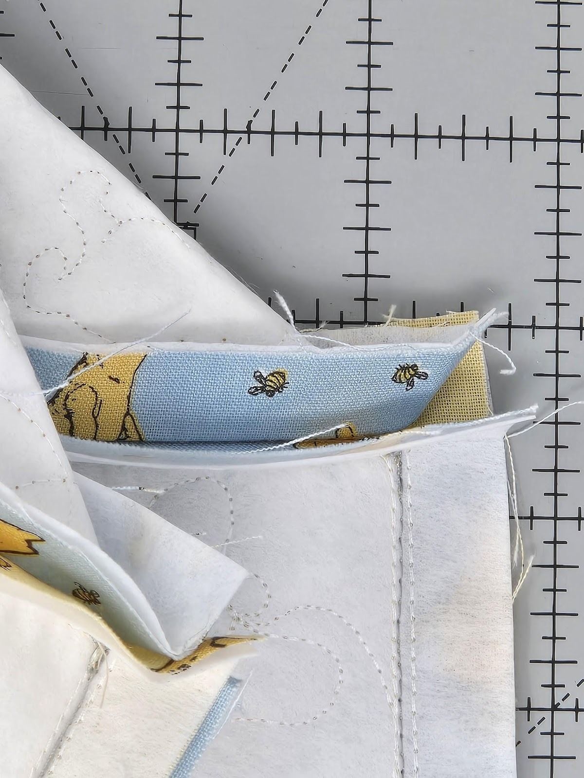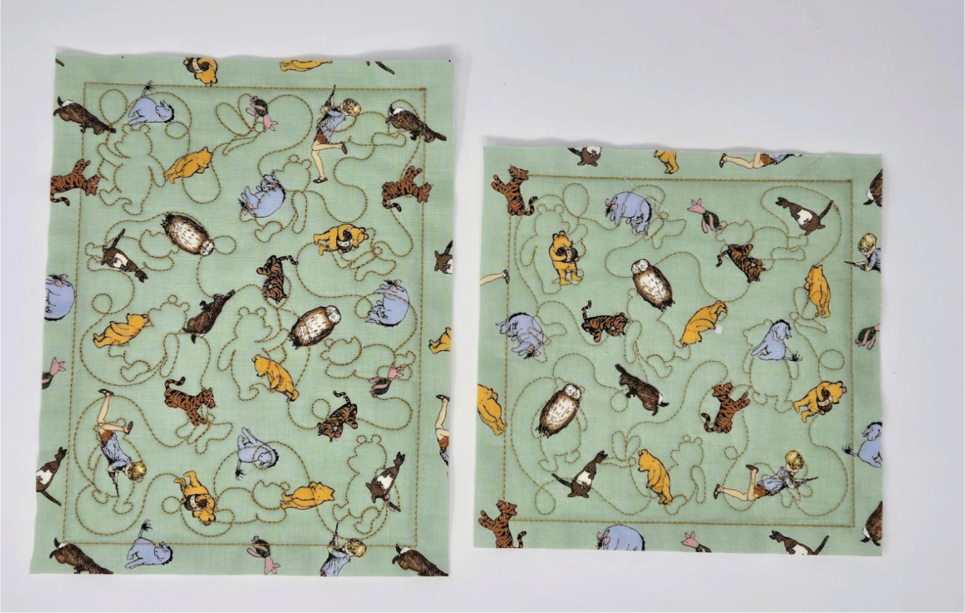 For the other two sides of the baskets and the bottom, I used cutEZ, batting, and the QB. I quilted the QB once on the bottom using the 6x6 square design, but twice for the two sides that only have the quilting. It's very easy to do this—simply back up a step and run the quilting a second time. Now it looks like you used a heavier thread without using a heavier thread. And the quilting really stands out more. Can you see the difference in the photo below? Look for Pooh.