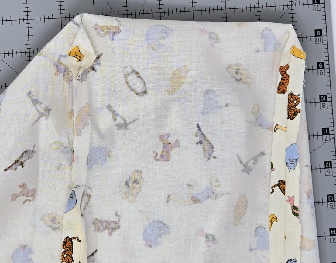 Then place the two sides with right sides together and sew with a ⅝” seam allowance. Sew from the top to the mark, then pivot and sew to the fabric edge. Backstitch when starting and stopping. Sew in ⅝” at the other mark and sew to the bottom. It will look like this: