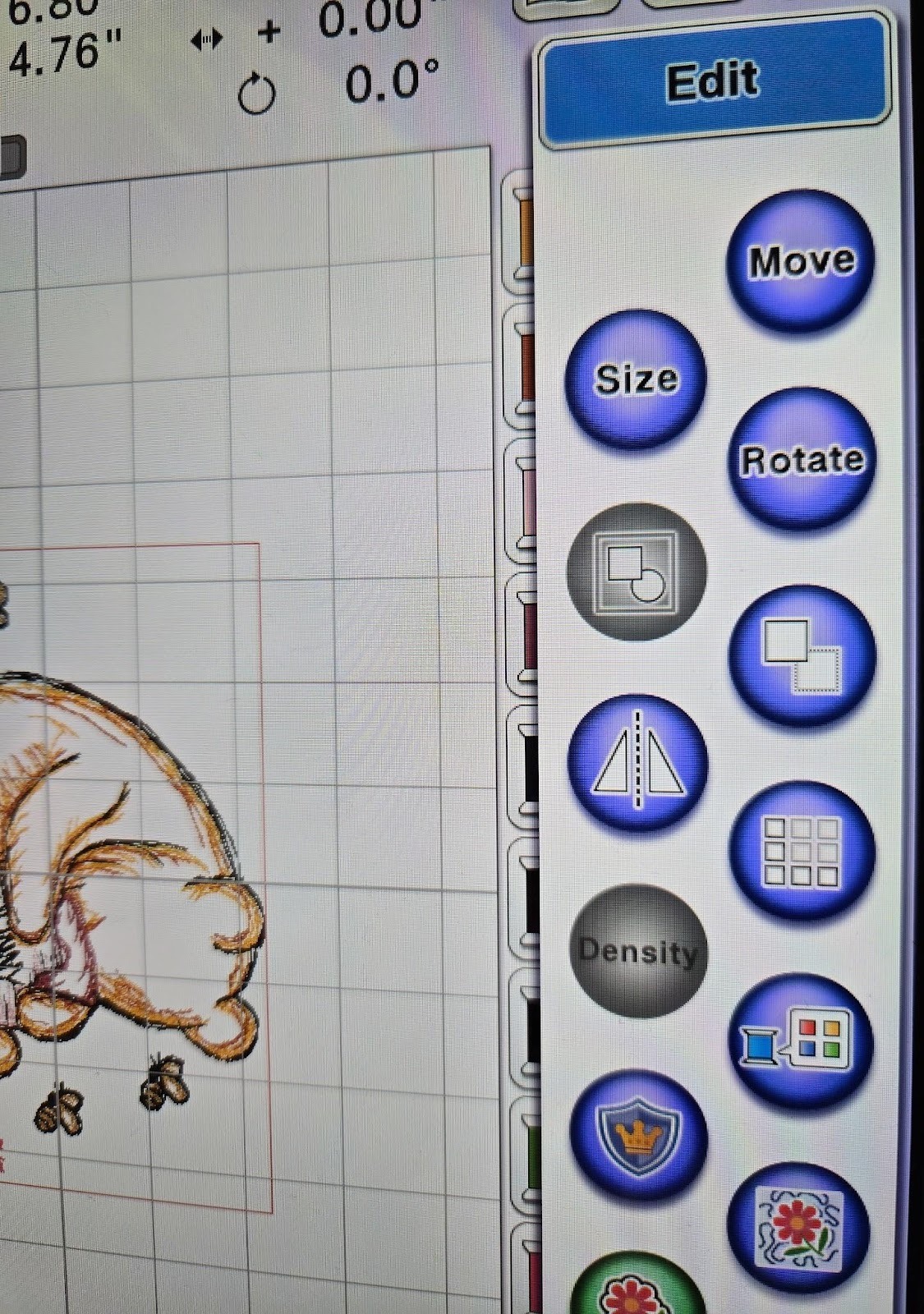 I used my Edit keys on my machine to rotate Pooh and I shrank him by 3 clicks. I should have done 4 or 5 to avoid losing part of the flowers. I also moved him down to about an inch from the bottom of the QB. This allows for the cuff to fold down at the top.