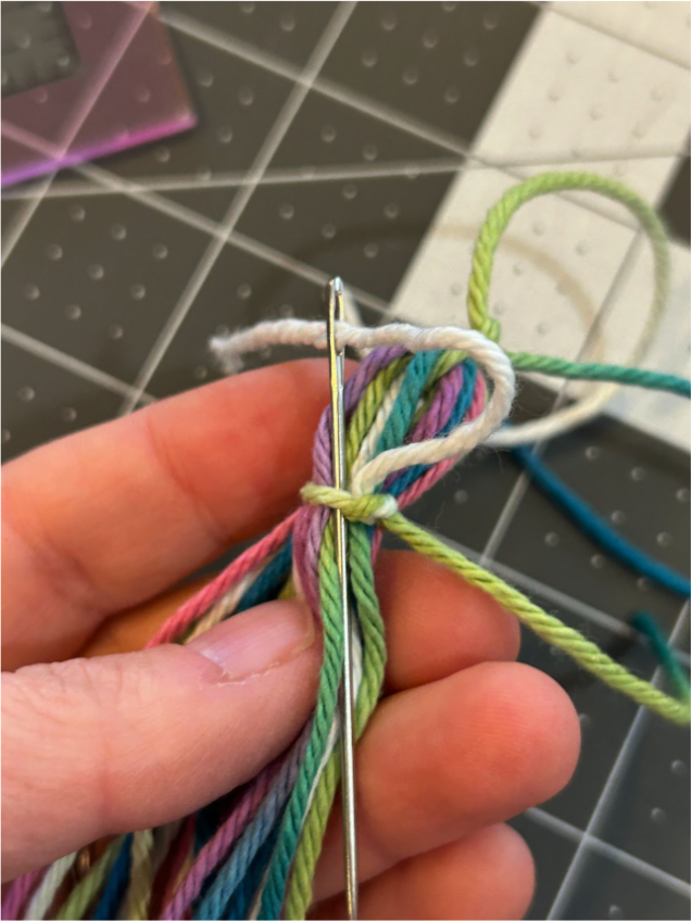 Using a 10” piece of yarn, thread it under the wraps.