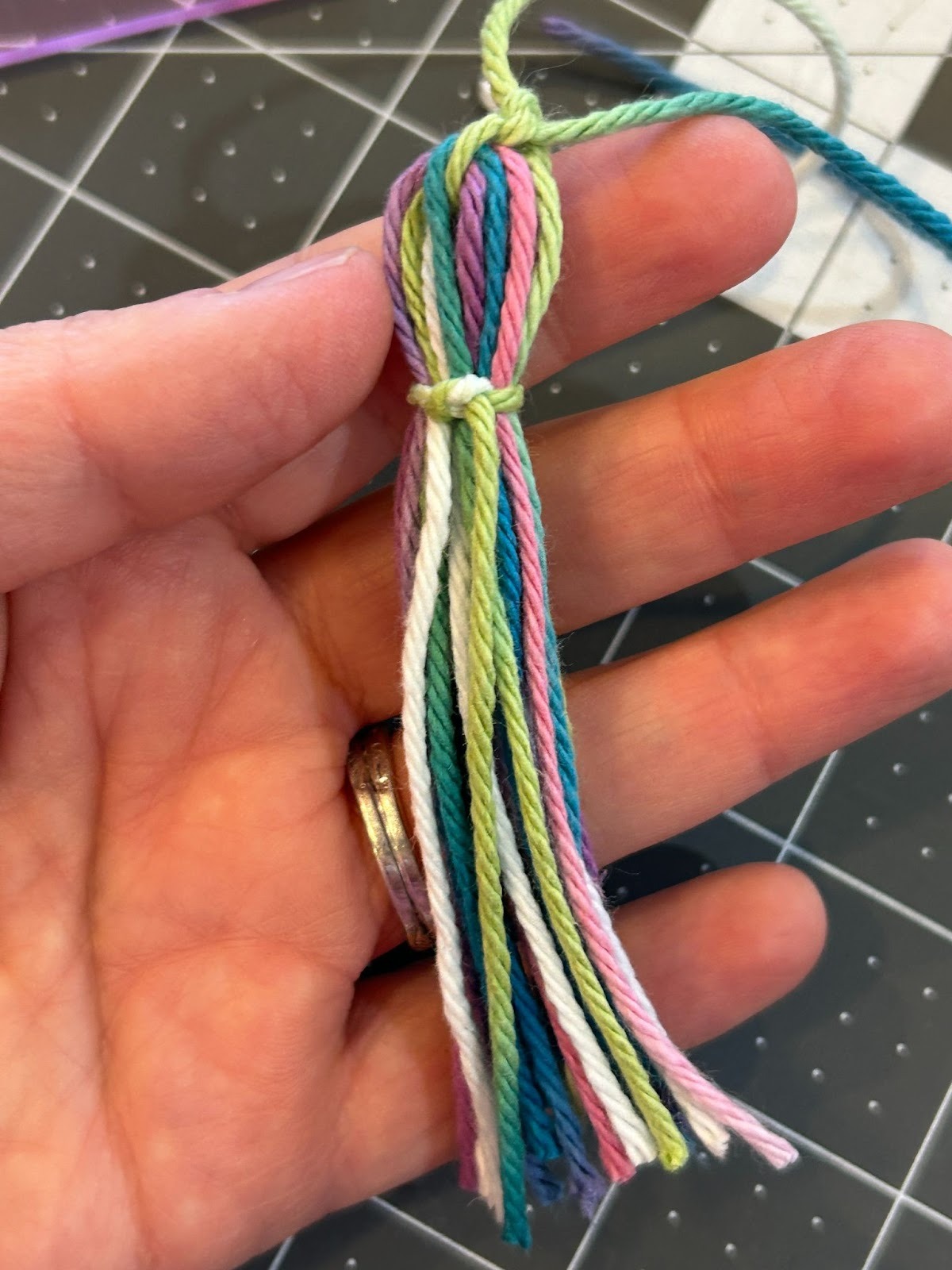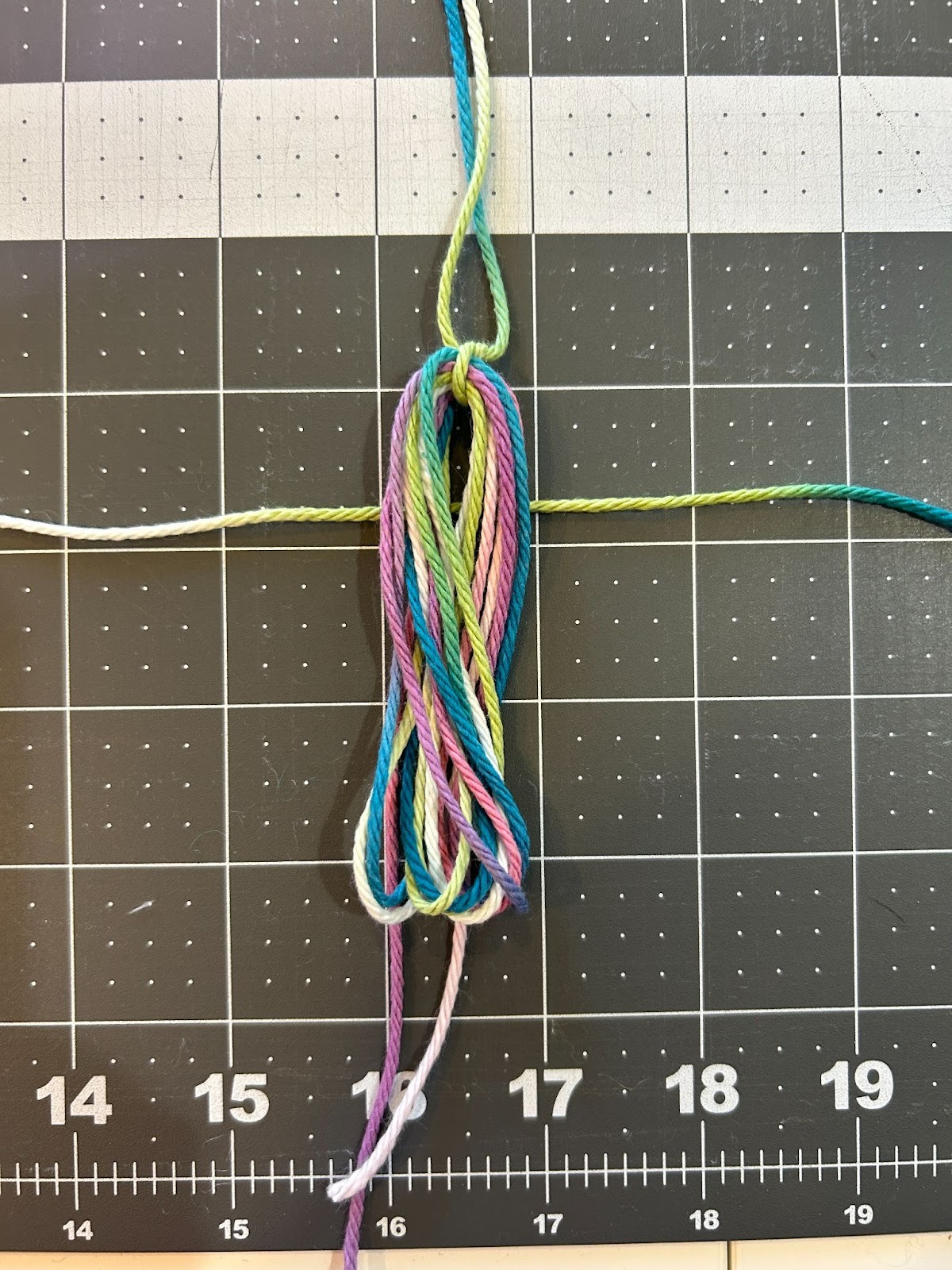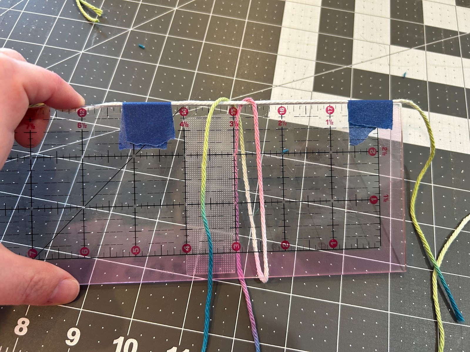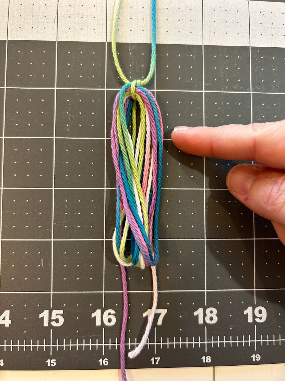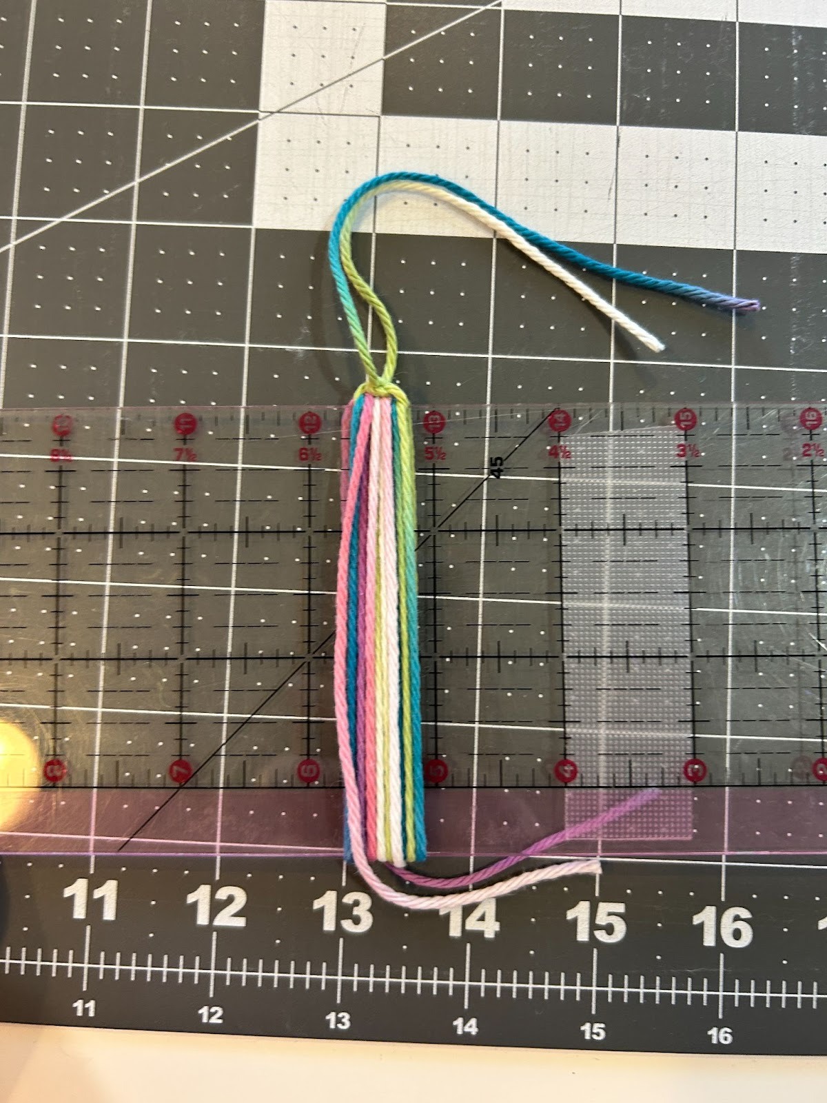 When I did the tassels with more wraps I noticed it was harder to thread the yarn under that many wraps so I started placing the top piece of yarn across the top of my ruler and taping it in place, and then wrapping the yarn.