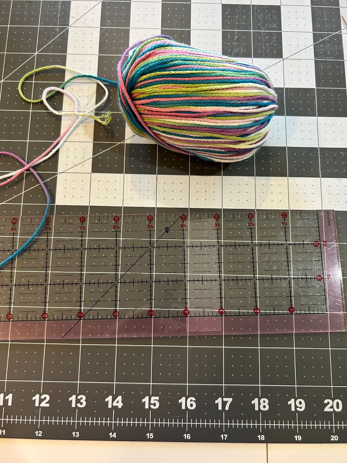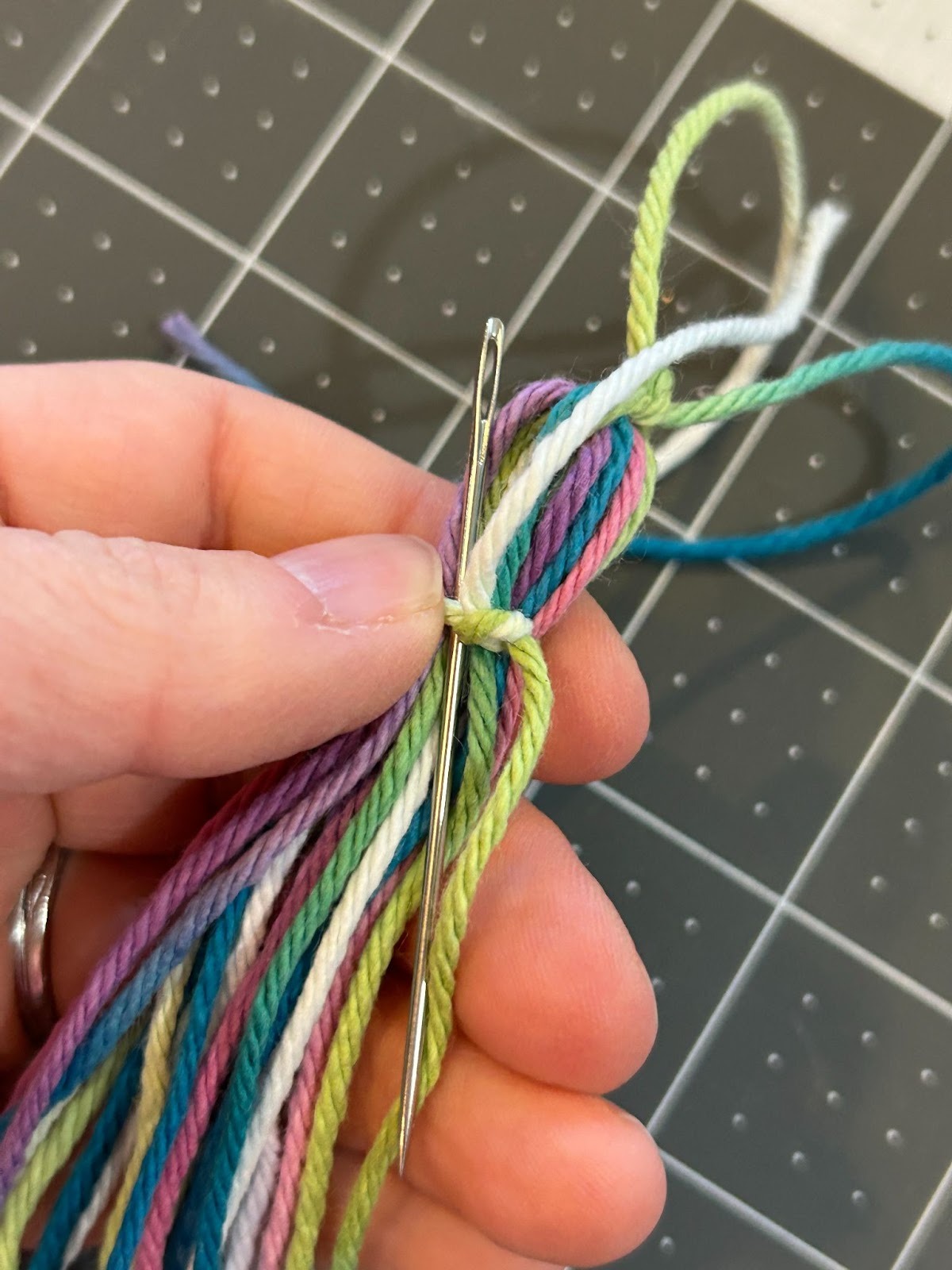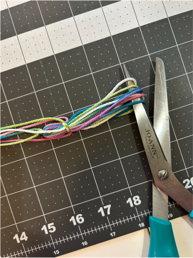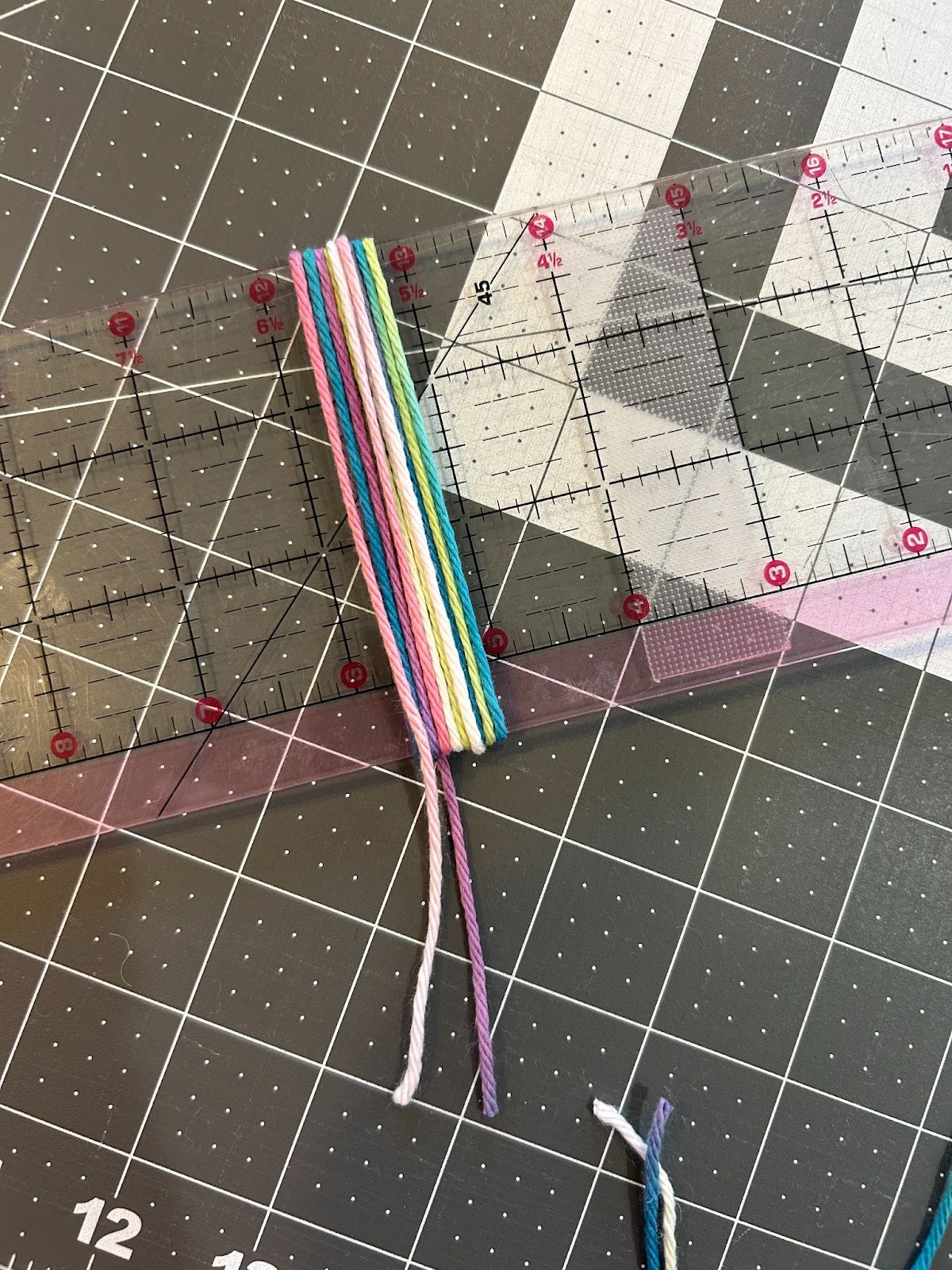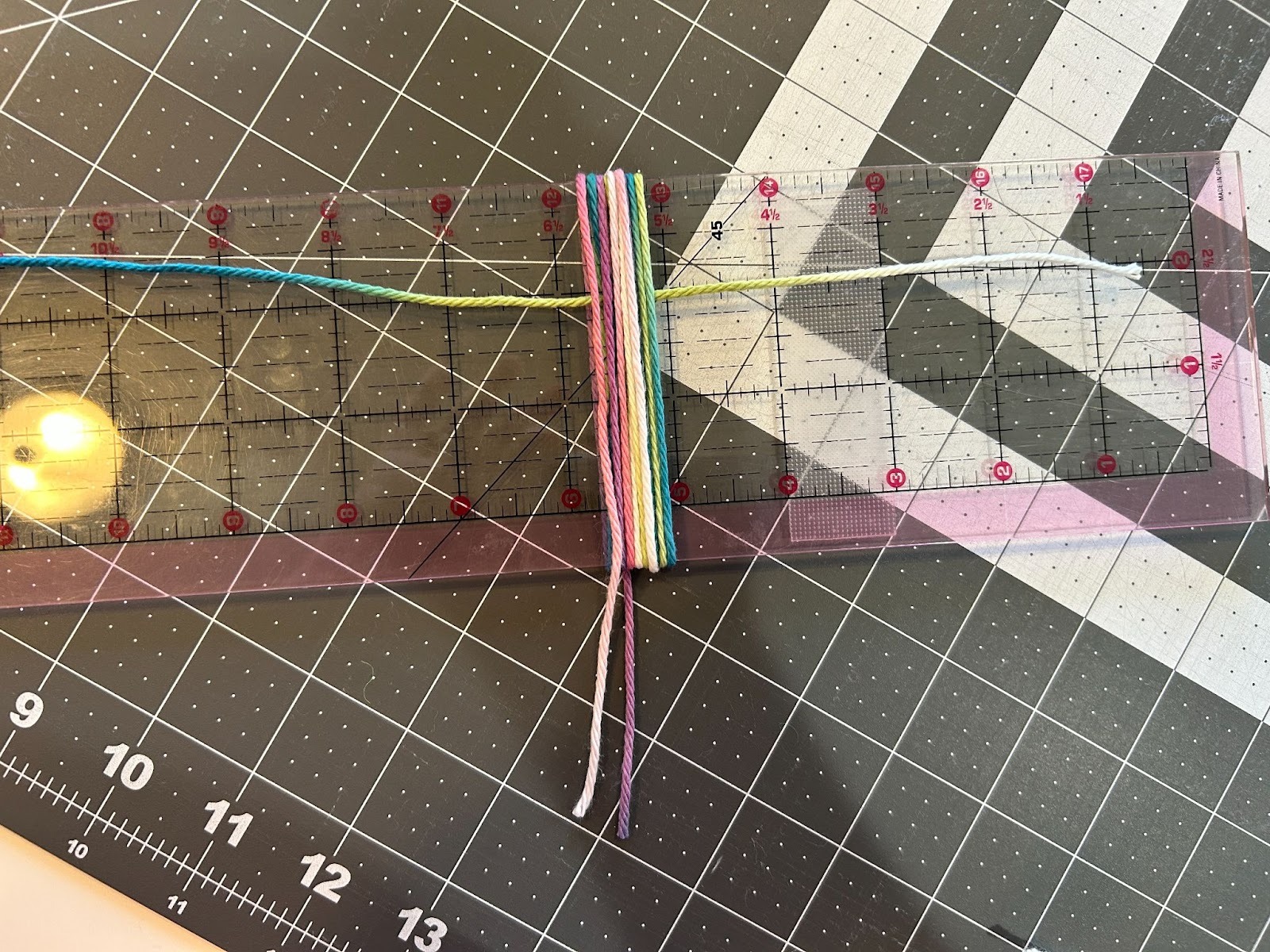 When I did the tassels with more wraps I noticed it was harder to thread the yarn under that many wraps so I started placing the top piece of yarn across the top of my ruler and taping it in place, and then wrapping the yarn.