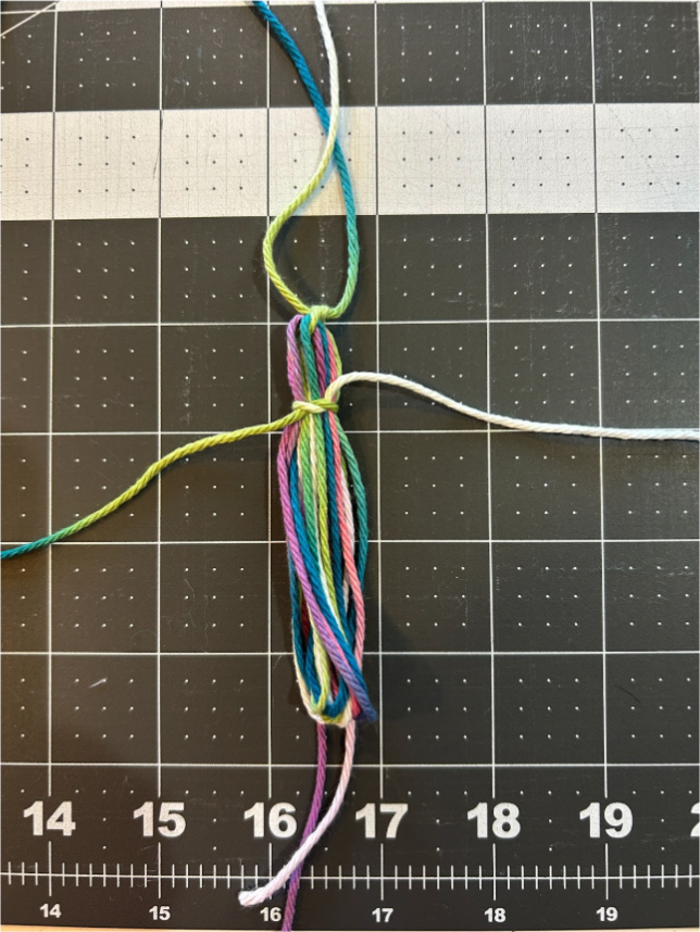 You can now slide your yarn off the ruler (or whatever you wrapped). Then decide where you want to have your next tie. I chose to place mine at about ¾” for my 3½” tassels.