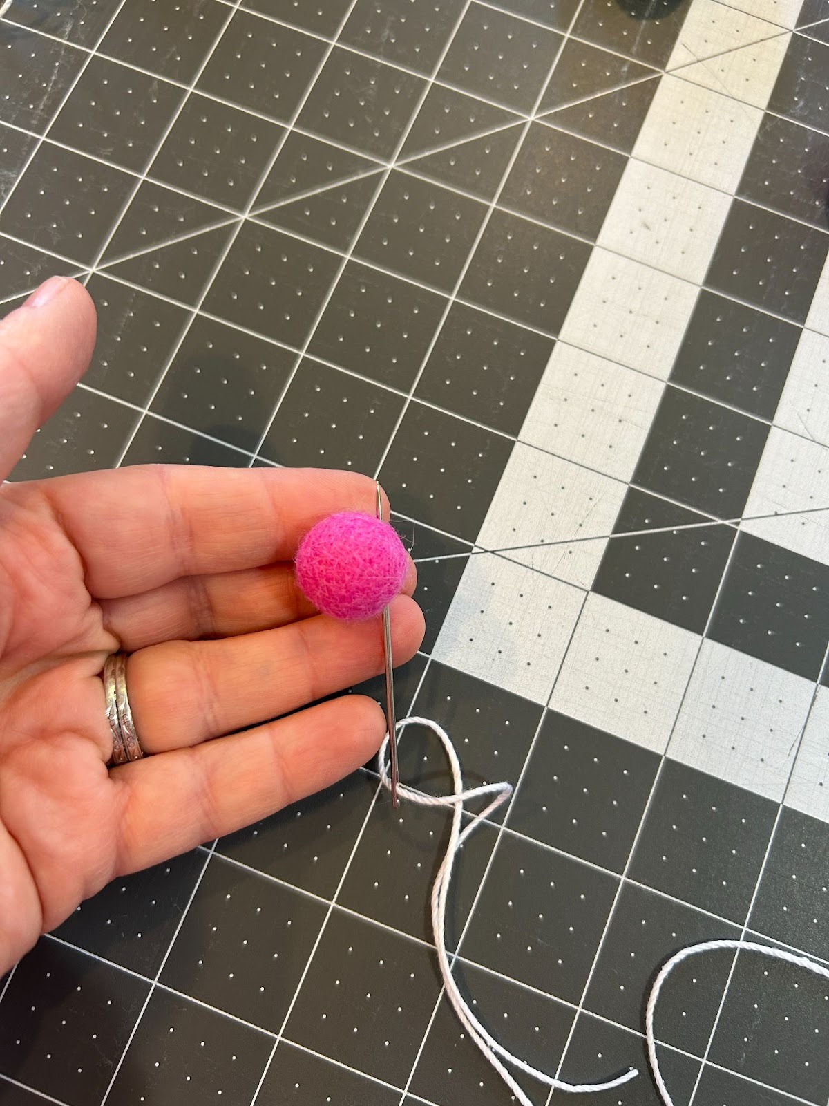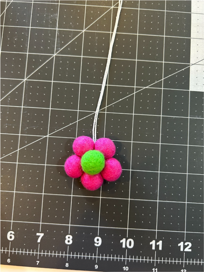 You will need five balls for the petals and one for the center, and about 18” of thread in your big needle. Starting with the petals, thread through the bottom ¼ of the ball. Keep a long tail for your flower.