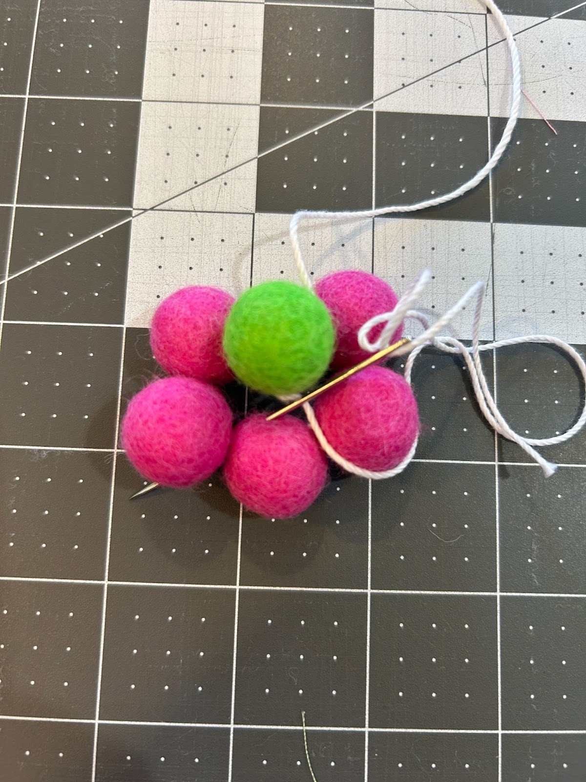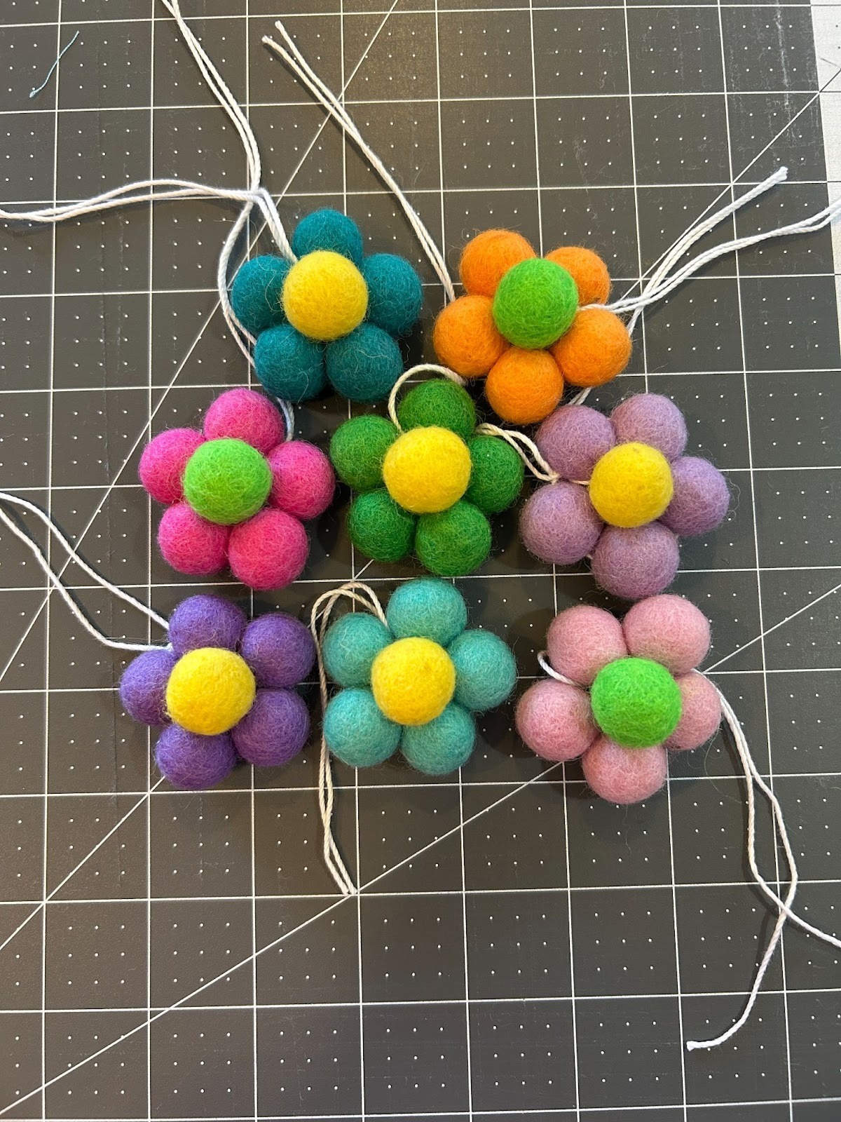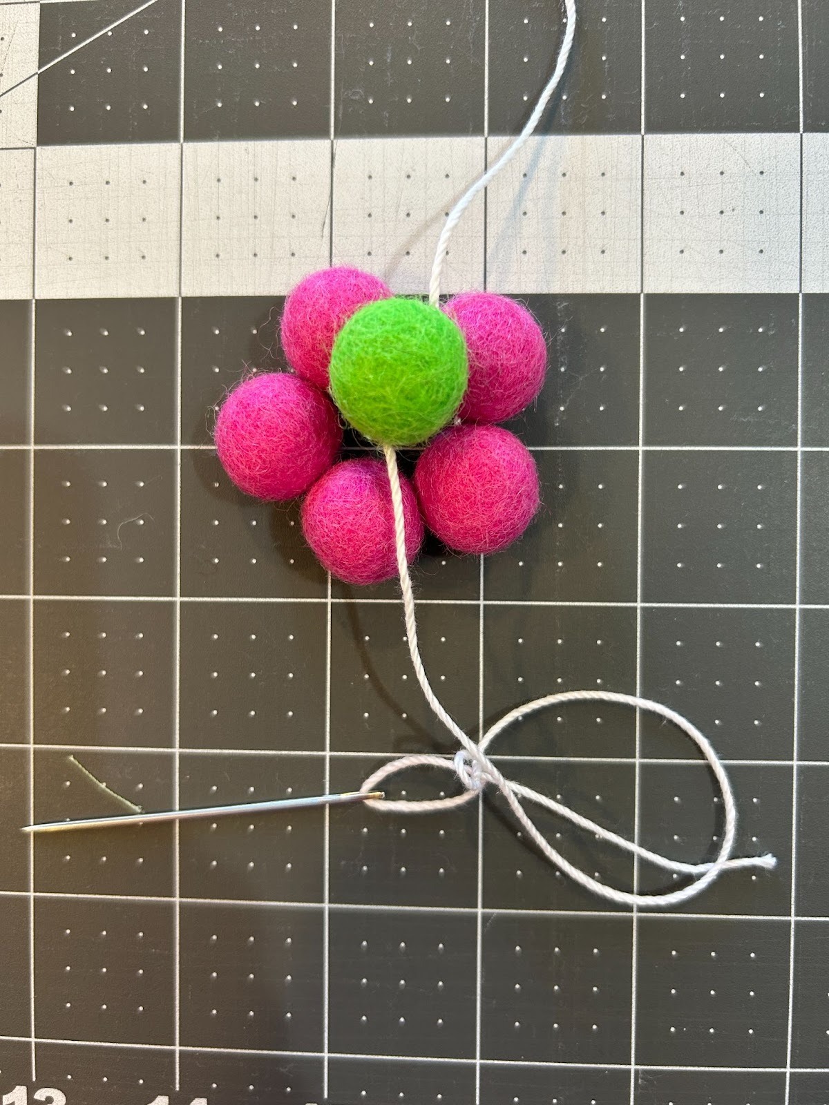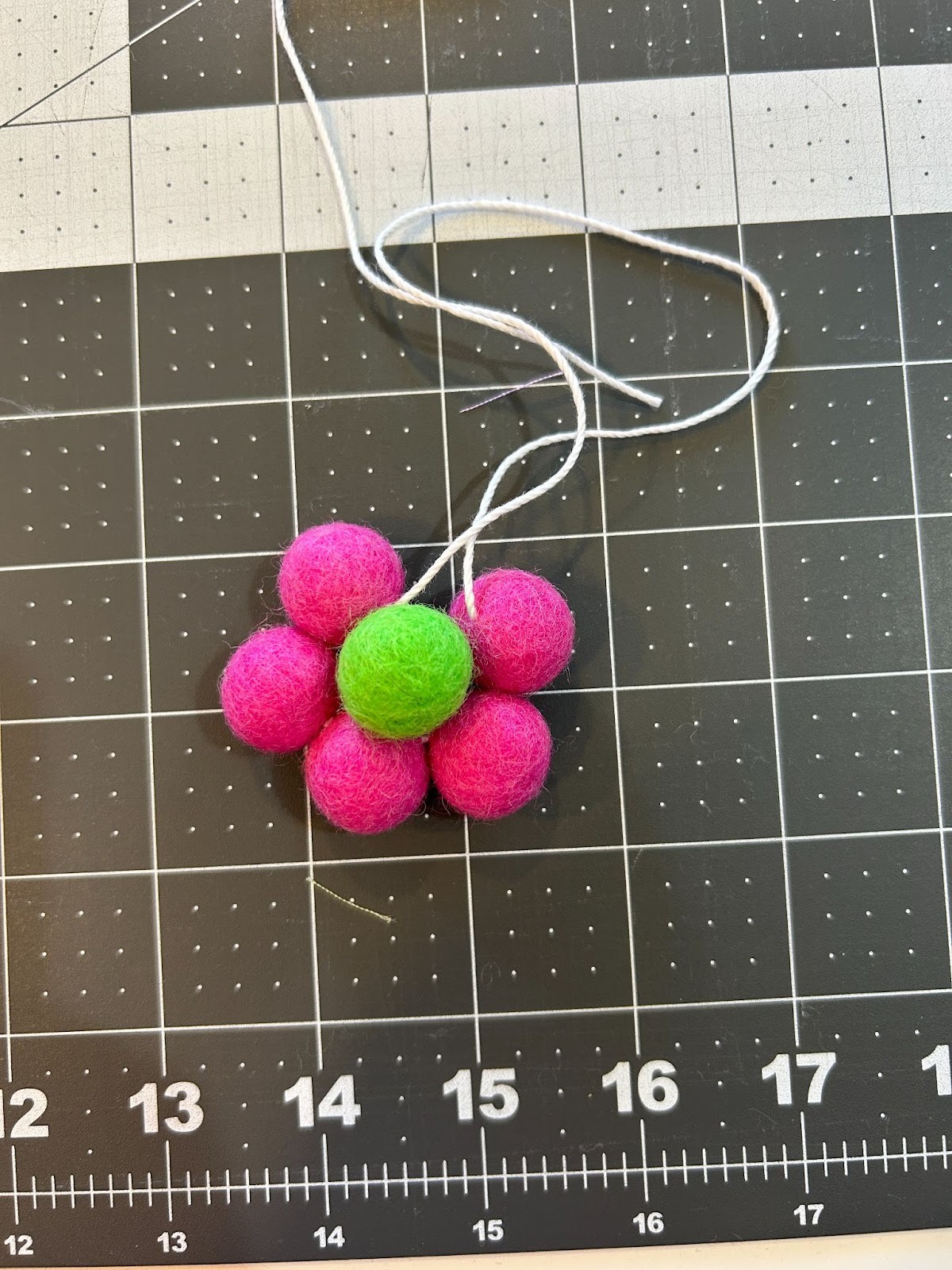 While the freestanding lace designs dried, I moved on to prepping the other things I wanted to use in my garland. I gathered my pack of .6” wool ball and crochet thread to make my wool flowers.
