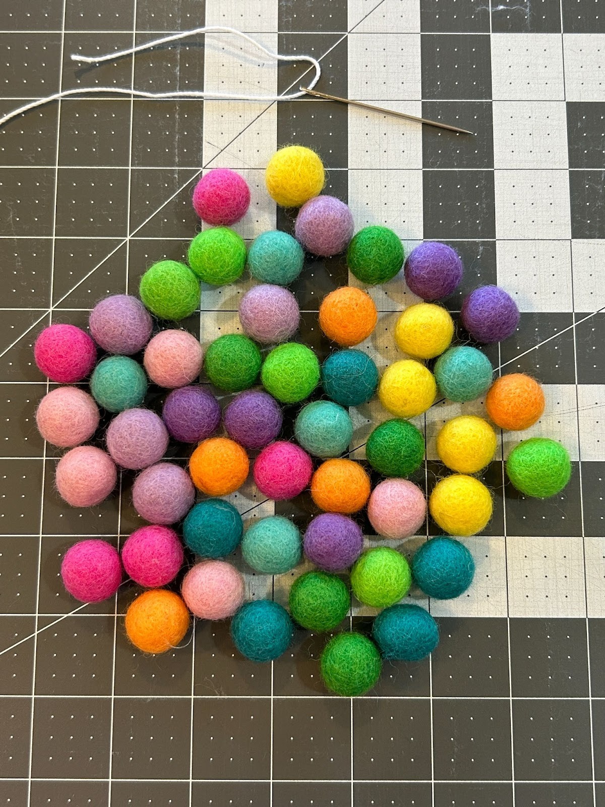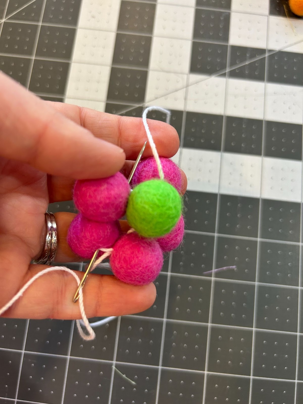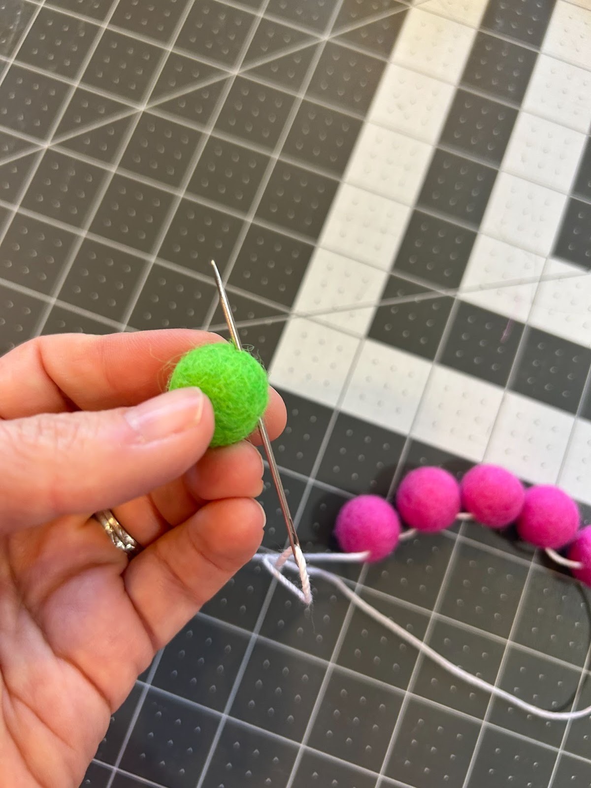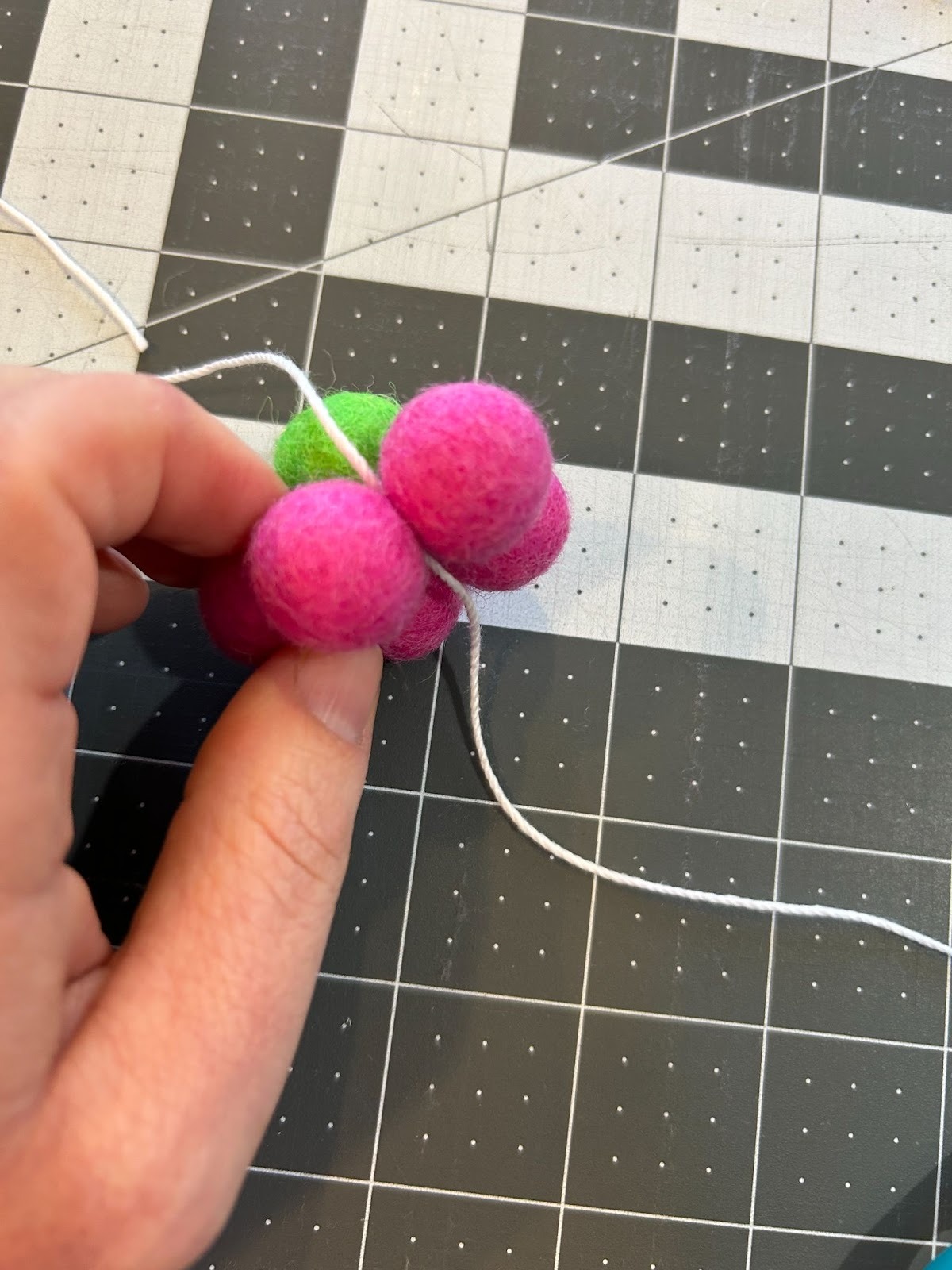While the freestanding lace designs dried, I moved on to prepping the other things I wanted to use in my garland. I gathered my pack of .6” wool ball and crochet thread to make my wool flowers.