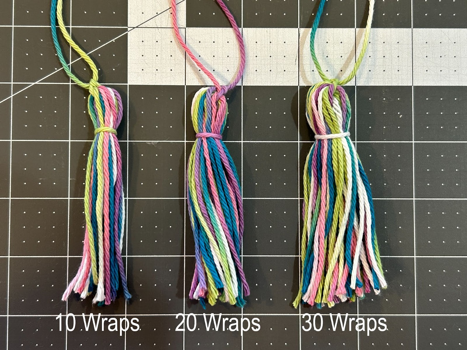 And there you have a finished tassel. I experimented and did tassels with 10, 20, and 30 wraps. This is how they looked finished. I used the 20-wrap tassels for my project.