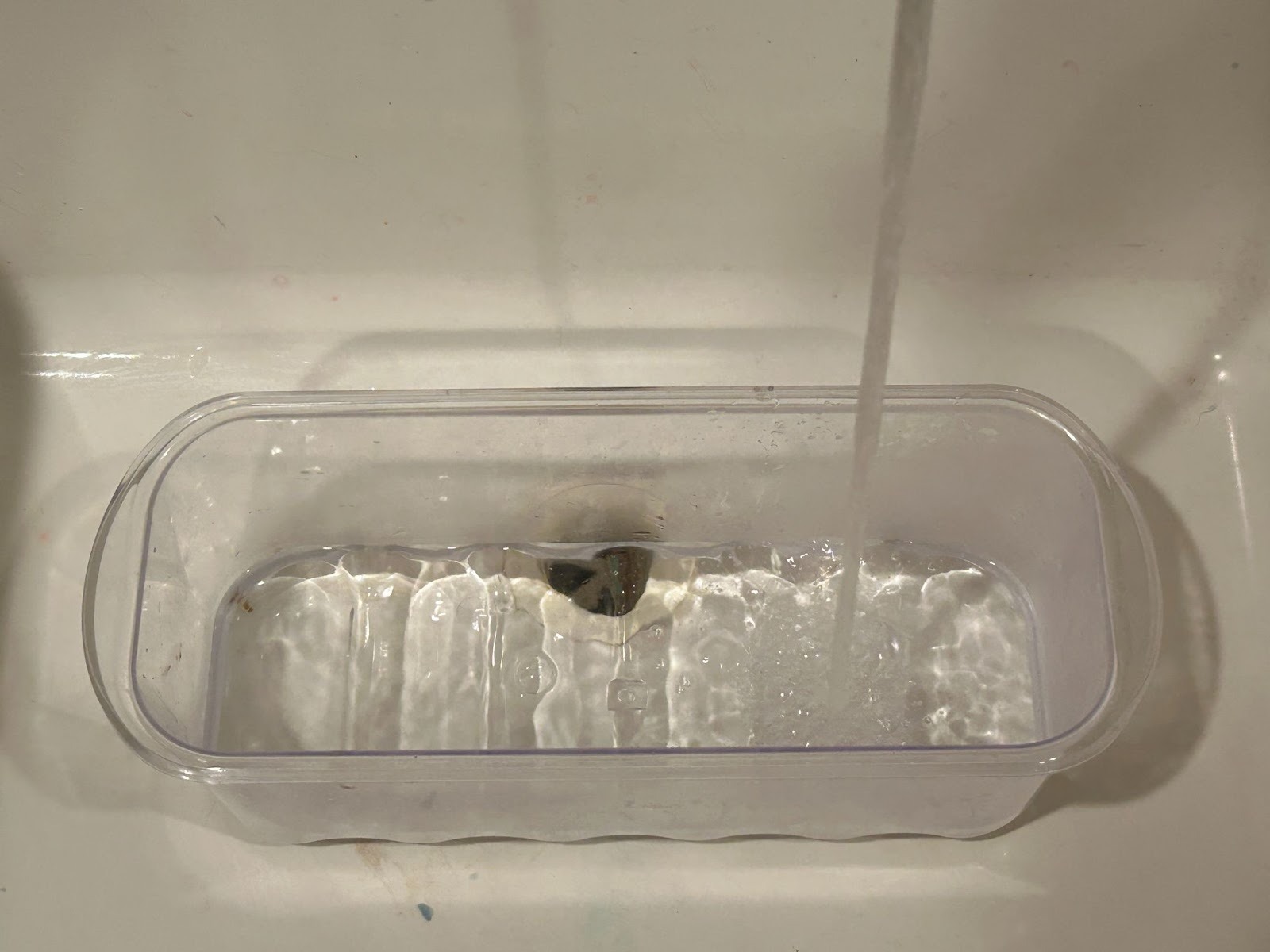 Now comes the fun part—we get to wash away the stabilizer. I fill a container in my sink with warm water.