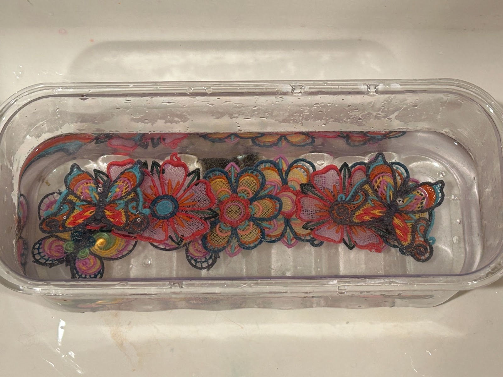 After they have soaked for a little bit, I pick up a design and swish it in the water. You can tell the stabilizer is dissolving from the design. You can use your fingernail to scratch away the edges if they aren’t loosening, but I find that mine usually disappear with a shake under the water. Hold them to the light and check to see if all the stabilizer has dissolved between the stitches.