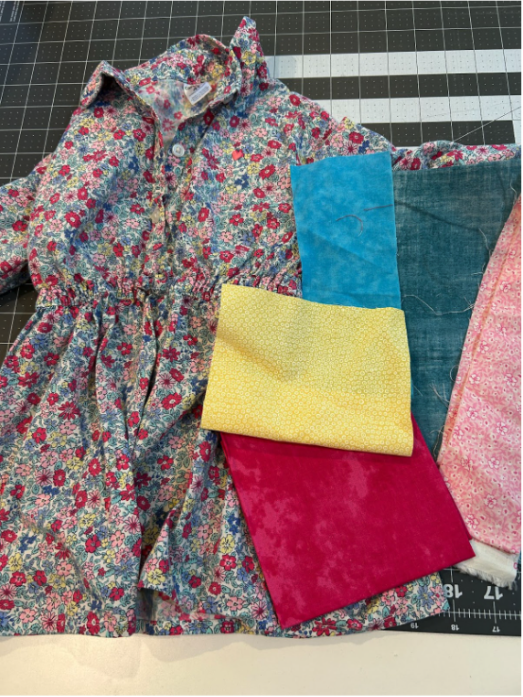 Assemble your clothes or memory fabrics left over from other projects and coordinate with fabrics to finish the block.